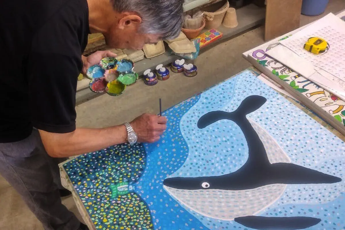 生き生きと動き出しそうな生き物と、カラフルなドット模様が特徴的な絵を描く。近年では、配色や配置を自身で考案して筆を走らせる。