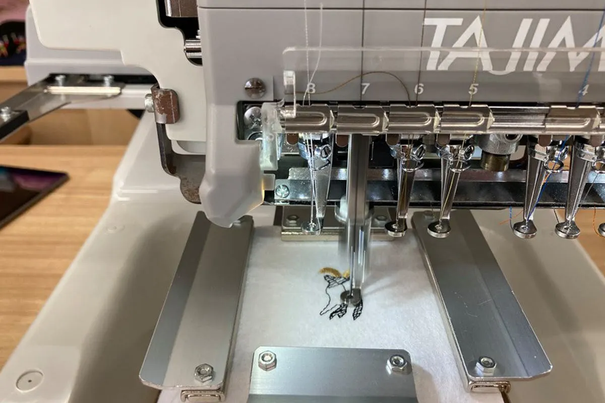 刺繍機“彩”はミシンメーカーTajimaの刺しゅう機です。Tajima(タジマ工業株式会社)は日本の工業用刺しゅう機のトップメーカーであり、地元(愛知県名古屋市)の会社さん。今回のプロジェクトでは、何度もサンプル作りの部分でアドバイスをいただき、ご協力いただいております!!!(本文の中の刺繍機の写真データ供給についてもご協力いただいております)