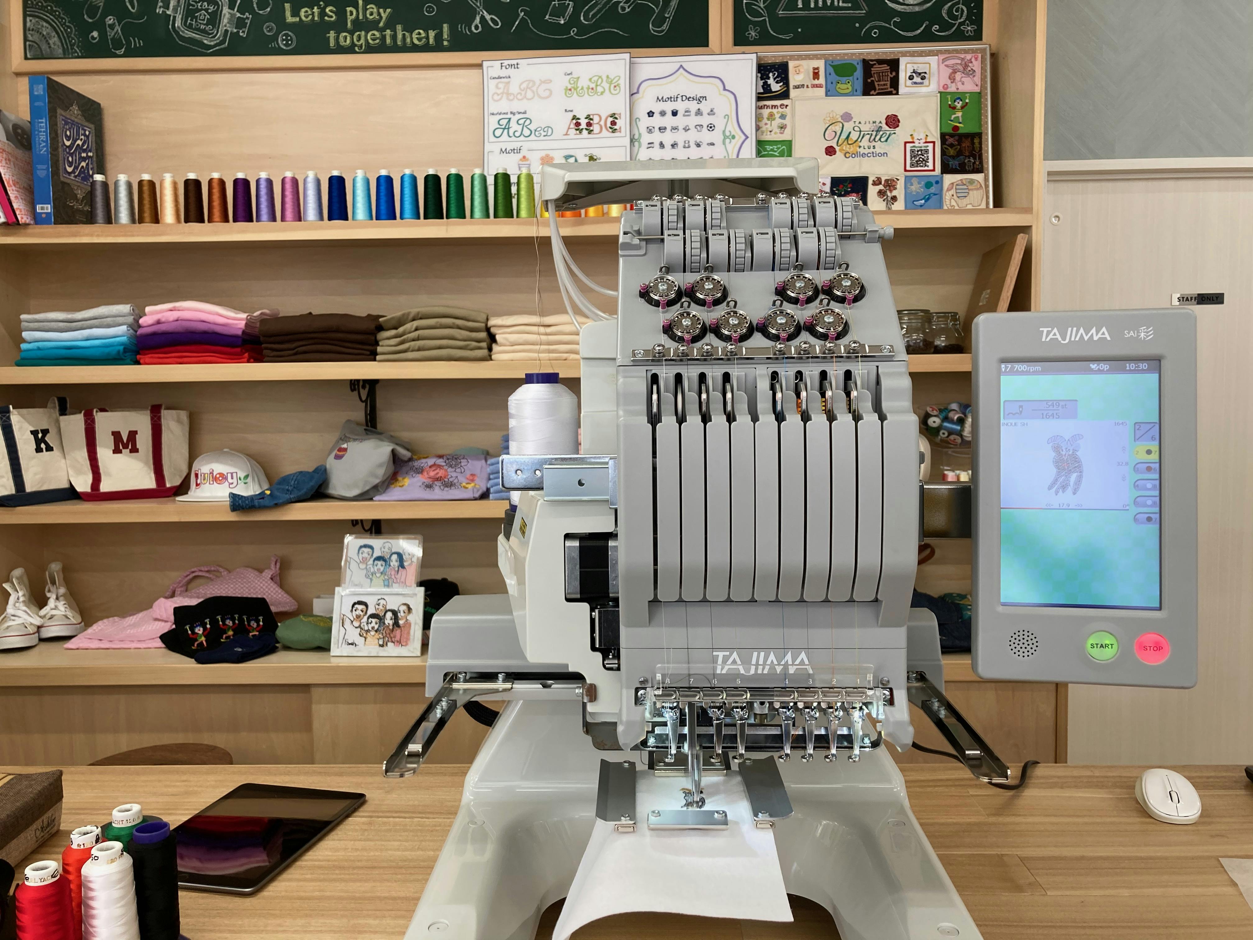 今回のクラウドファンディングでの目標になっている、写真の刺繍機は、タジマ工業(株)の「彩」という機械です。