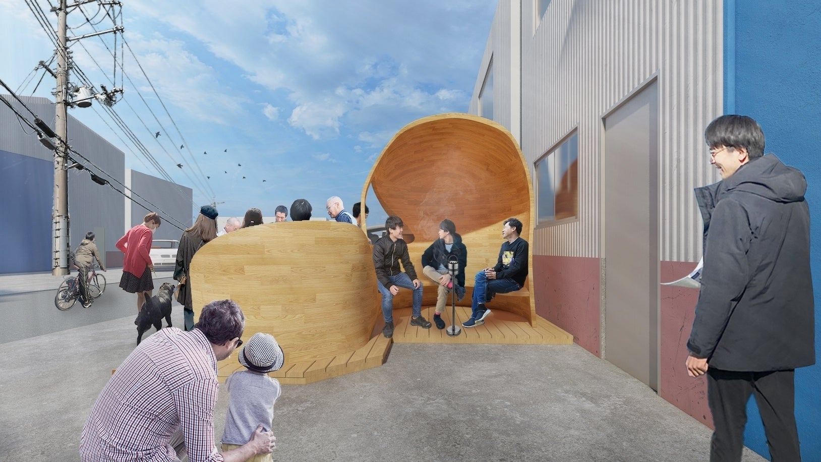5軸CNCによって、有機的な木材表現が最大限施されたこの休憩所は、屋外での休息に、木質空間で感じる新しい豊かさを提案します。S字の形状は、中と外で過ごす人同士の視線が繋がるデザインになっています。本当に木でできているのか!?と見る人は、わっと驚くはずです。シンボリックな形状は人々が集まる新たな地域の顔となることでしょう。