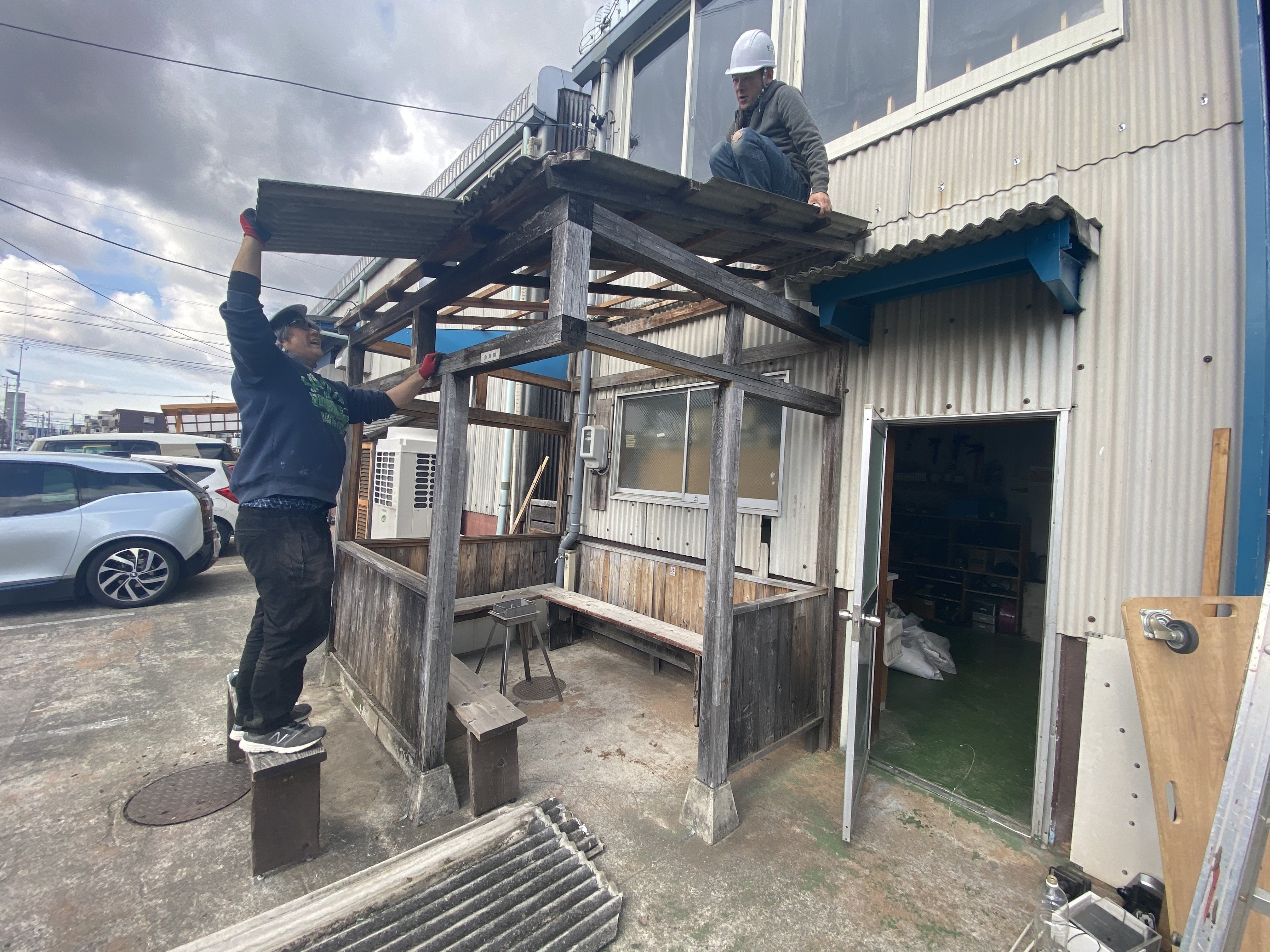 アーティストリーの大西です。今まで使われていた弊社の休憩所の解体が職人たちの手により完了しました。社員からお客様の憩いの場となってくれていた休憩所、永い間お疲れさまでした。完成するまではベンチを置いて青空休憩所そして、いよいよ「わの休憩所」がここに納まるための準備です。写真では分かりにくいですが、地面が傾斜しており、安定して設置するためと、見栄えを良くするために、ステージを製作することにしました。手掛けるのは、大工をしている社長の弟さんです。今回のプロジェクトに一肌脱いでくれています。使うのは、チャネルオリジナルさんの屋久島地杉材。屋久杉のステージなんて、とても贅沢です。また、ステージの方も進捗ありましたら、報告させていただきます。