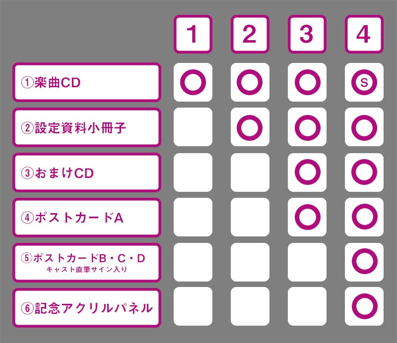 ②に加えて「おまけCD」と「ポストカードA」が付いたリターンです。おまけCDには「追加楽曲」と「収録後キャストトーク」が収録されます。ポストカードAは3名のキャラクターが描かれたポストカードに参加キャスト3名の印字のサインが入ったものです。なお、おまけCDは「クラウドファンディング限定」となります。収録内容は以下のとおり。