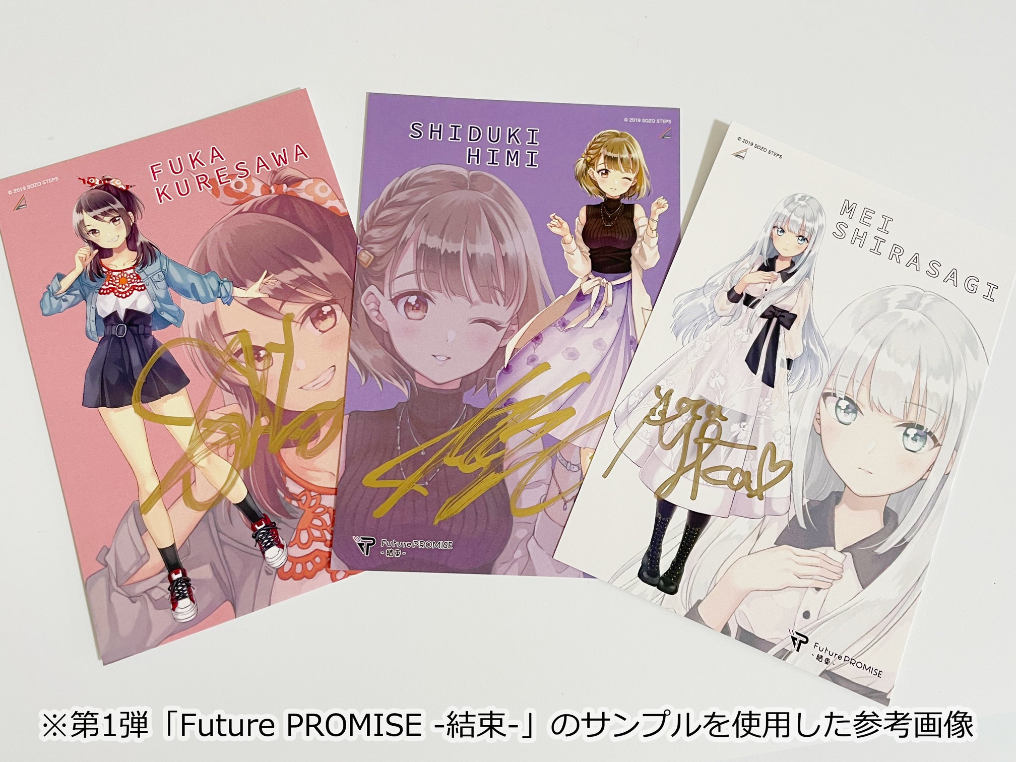 ③に加えて「ポストカードB・C・D」と「記念アクリルパネル」が付いた数量限定(60名)のリターンです。ポストカードB・C・Dは各キャラクターごとのもので、キャラクターに対応したキャスト様にそれぞれ直筆でサインを入れてもらいます(BCD系3枚になります)。記念アクリルパネルはクリアパネルにキャラクターイラストと参加キャスト3名の印字のサインが書かれたものです。