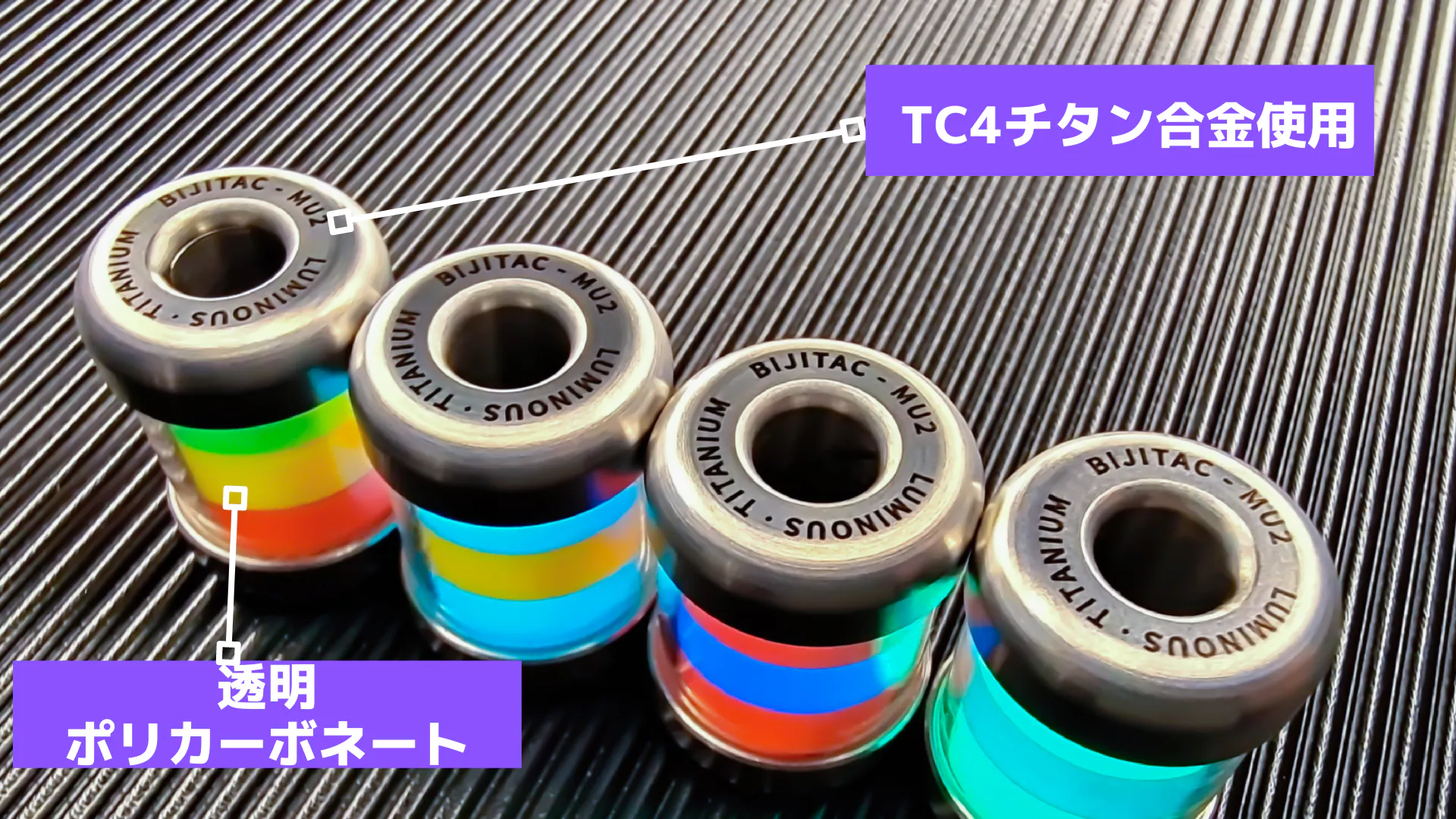 軽量で強度・耐食性・耐熱性に優れたTC4チタン合金から削り出したキャップを採用。本体は透明ポリカーボネートで、熱に強く強度も高く耐衝撃性は一般的なガラスの200倍以上と言われています。チタン+ポリカーボネートの組み合わせは、割れにくい商品設計になっております。