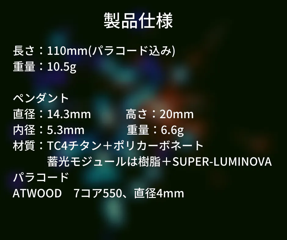 夜だって楽しみたいあなたにおすすめ!幻想的な光を放つTC4チタン製ルミナスペンダント!SUPER-LUMINOVAという蓄光材料を使い、全く放射能を使っていないので人体に悪い影響がでることはありません。安心してご利用いただけます。