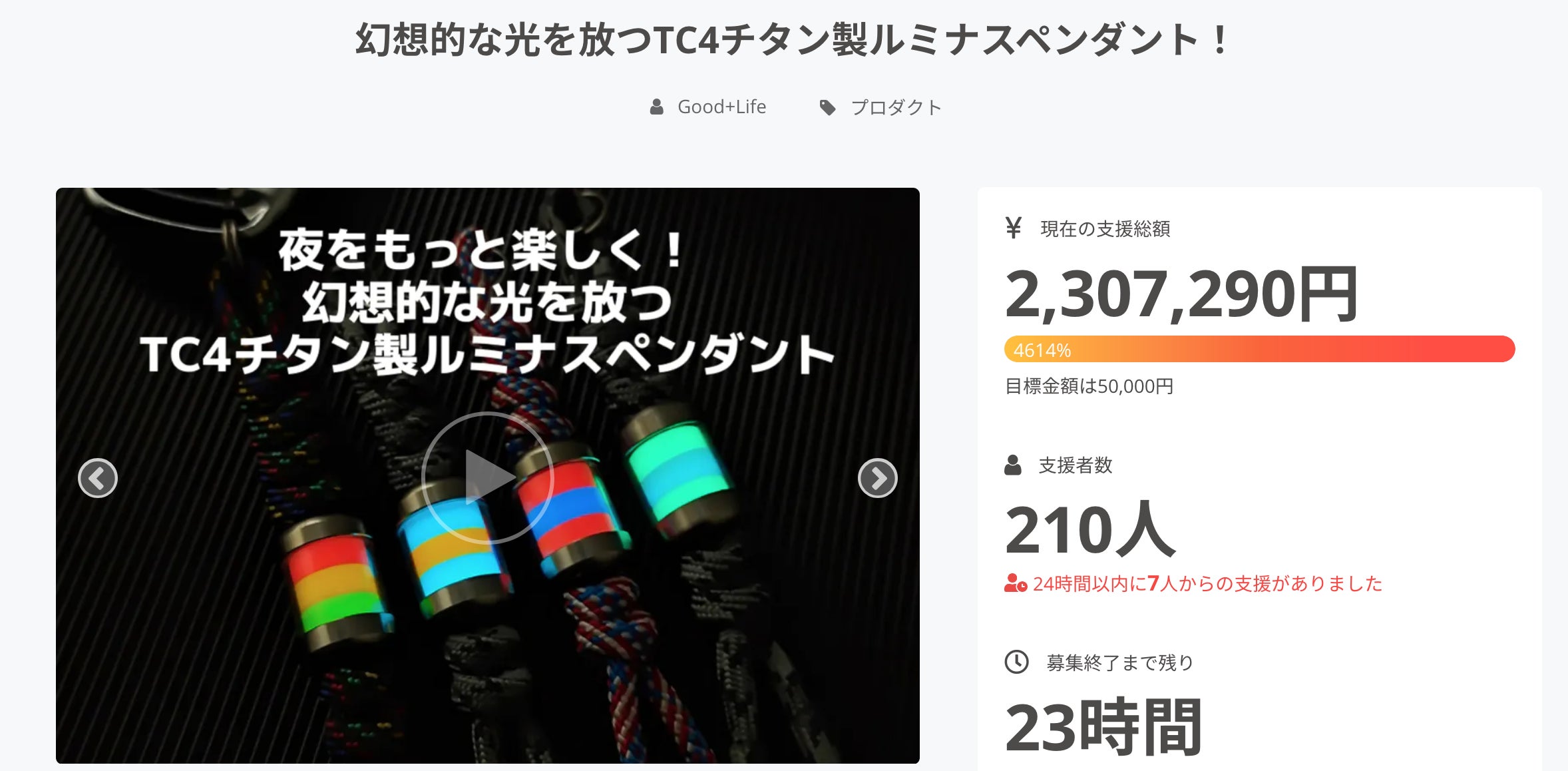 2か月間にわたり多くの方々からご支援やご声援をいただきましたクラウドファンディング「幻想的な光を放つTC4チタン製ルミナスペンダント!」の終了まで残り24時間を切りました。サポーター募集開始時から予想を超える反響を受け、プロジェクト終了まで24時間となる現在は210人を超えるサポーターの皆様から230万円以上のご支援を頂いております。ご支援いただいた皆様、誠にありがとうございます!終了まで残りすこしですが、ご拡散とご支援のほどよろしくお願い申し上げます。Good+Life