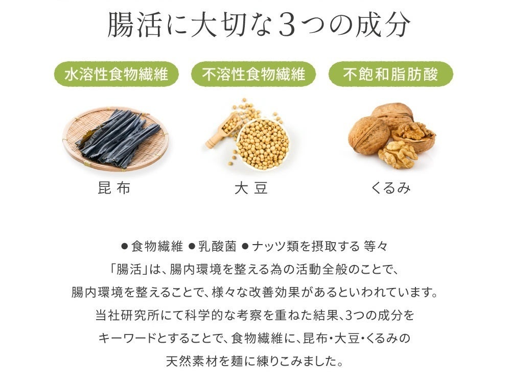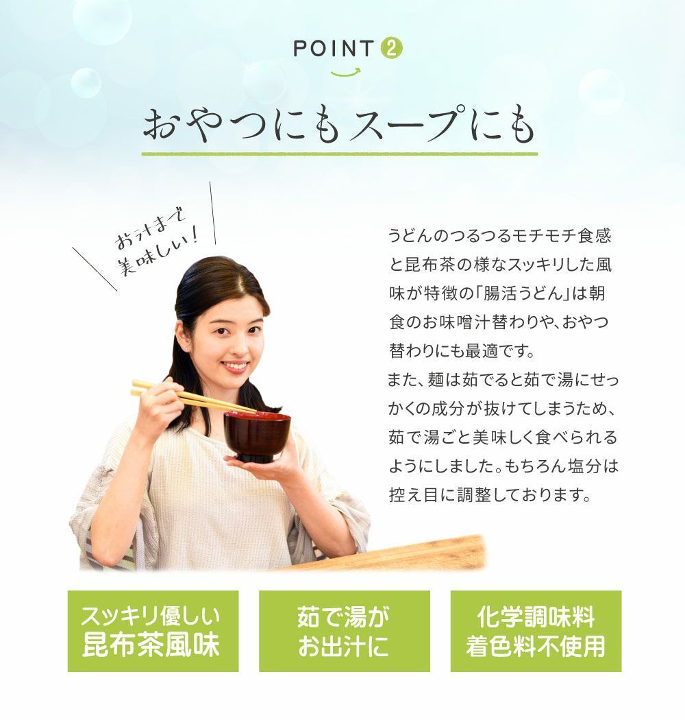 当社のお客様の中でも「腸活」にご興味がある方は多く、化学調味料や合成保存料を使用していない当社のうどんで実現できれば世の中の為になる、との想いから、「腸活うどん」を開発しました。