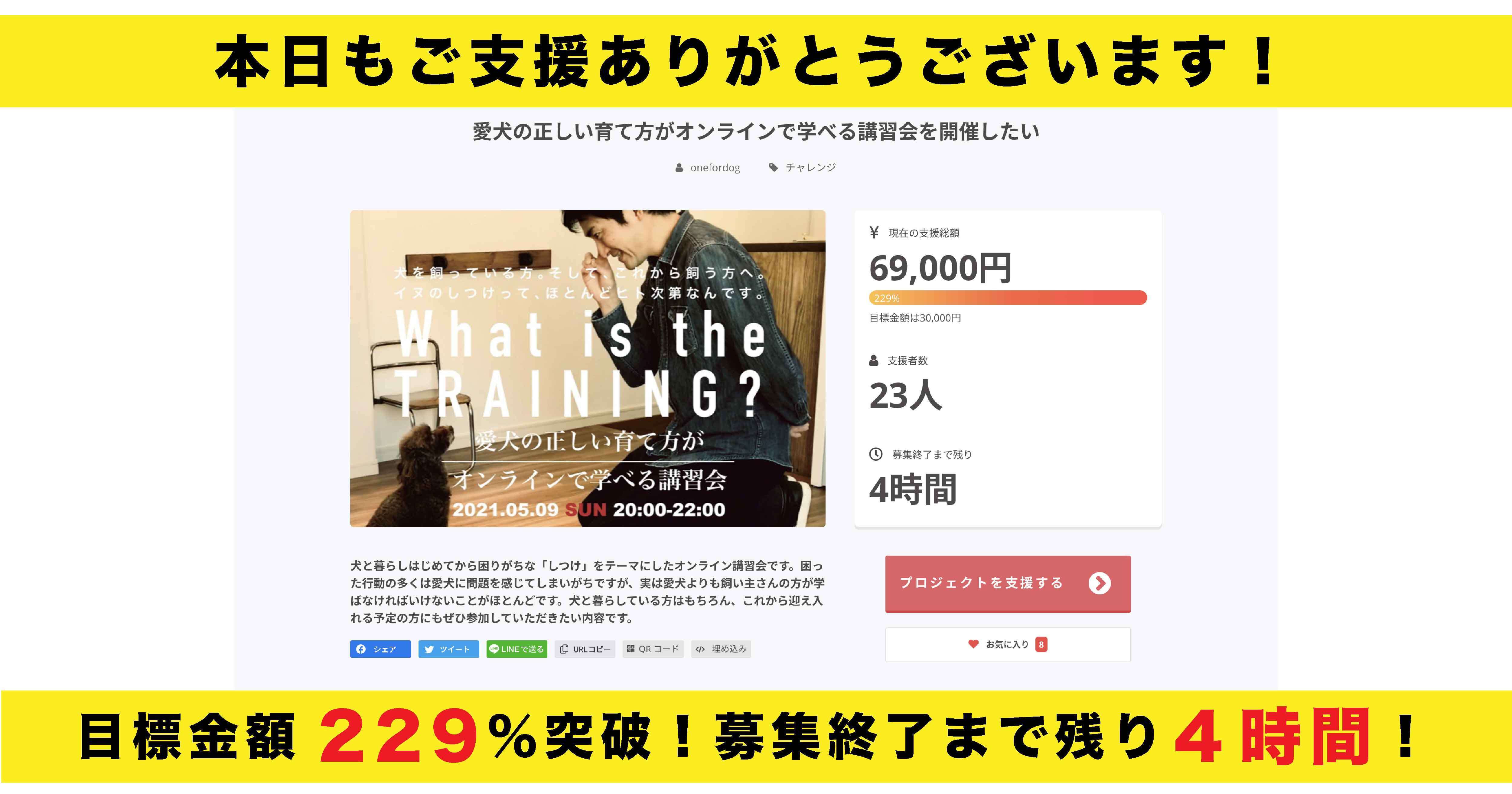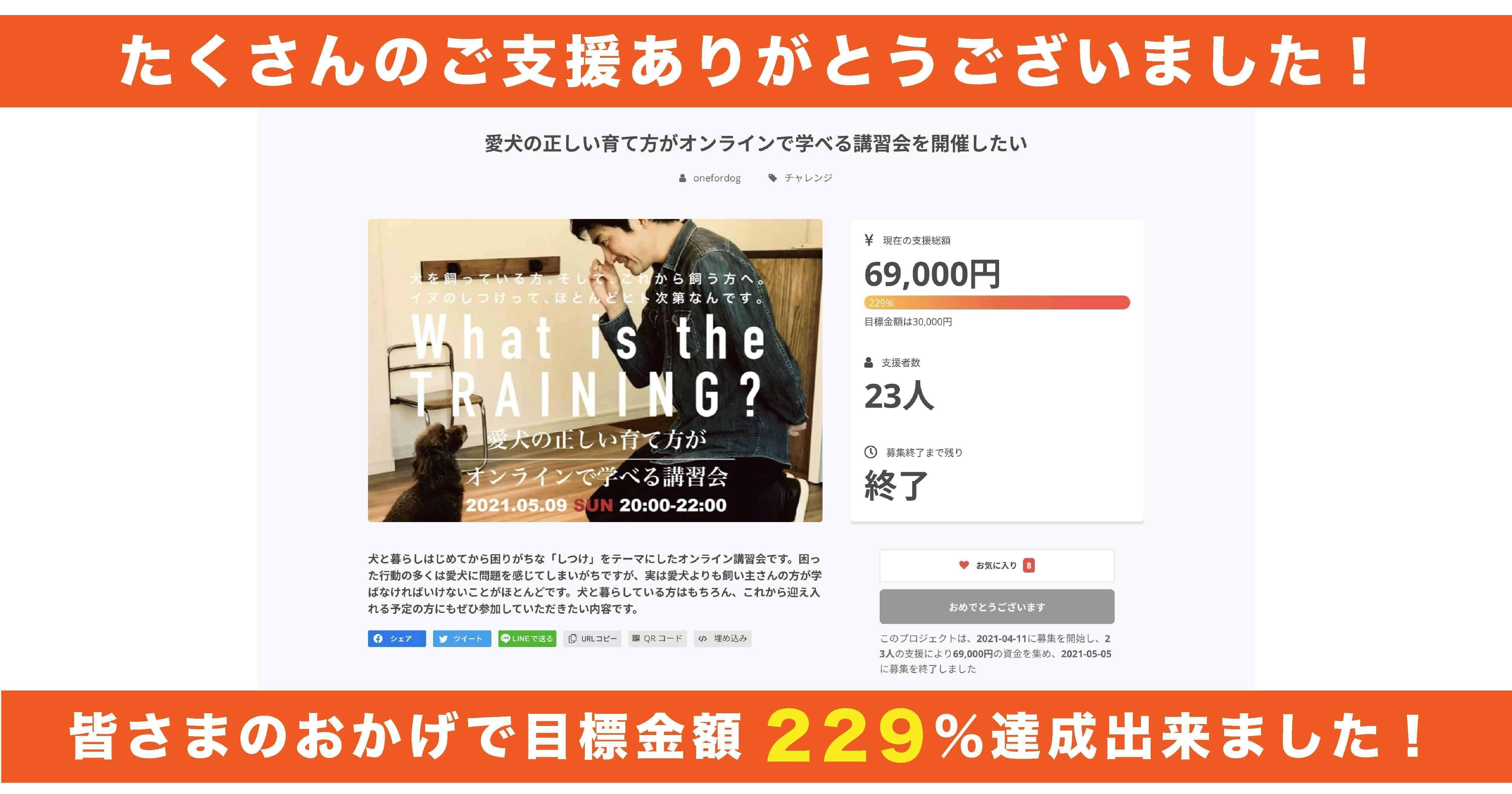 2021/05/06 10:28この度はOne for Dog のクラウドファンディング「愛犬の正しい育て方がオンラインで学べる講習会を開催したい」にご支援いただきありがとうございました!たくさんの飼い主さん達からご支援をいただいた結果、前回のプロジェクトを上回るお申し込みをいただくことが出来ました!この機会に少しでも愛犬家の皆さまのリテラシーを高められたらと思っています。講習会当日は楽しみながらしつけが学べるよう気合いを入れて望みたいと思います!まずは募集終了を無事迎えられたことに改めて御礼申し上げます。それでは、All or Nothing 方式に基づきプロジェクトがSUCCESSしましたので、お約束どおり「愛犬の正しい育て方がオンラインで学べる講習会」を実行します。後日、改めてメッセージをお送りしますので、今しばらくお待ちくださいませ。応援ありがとうございました!One for Dog齋藤 大 もっと見る