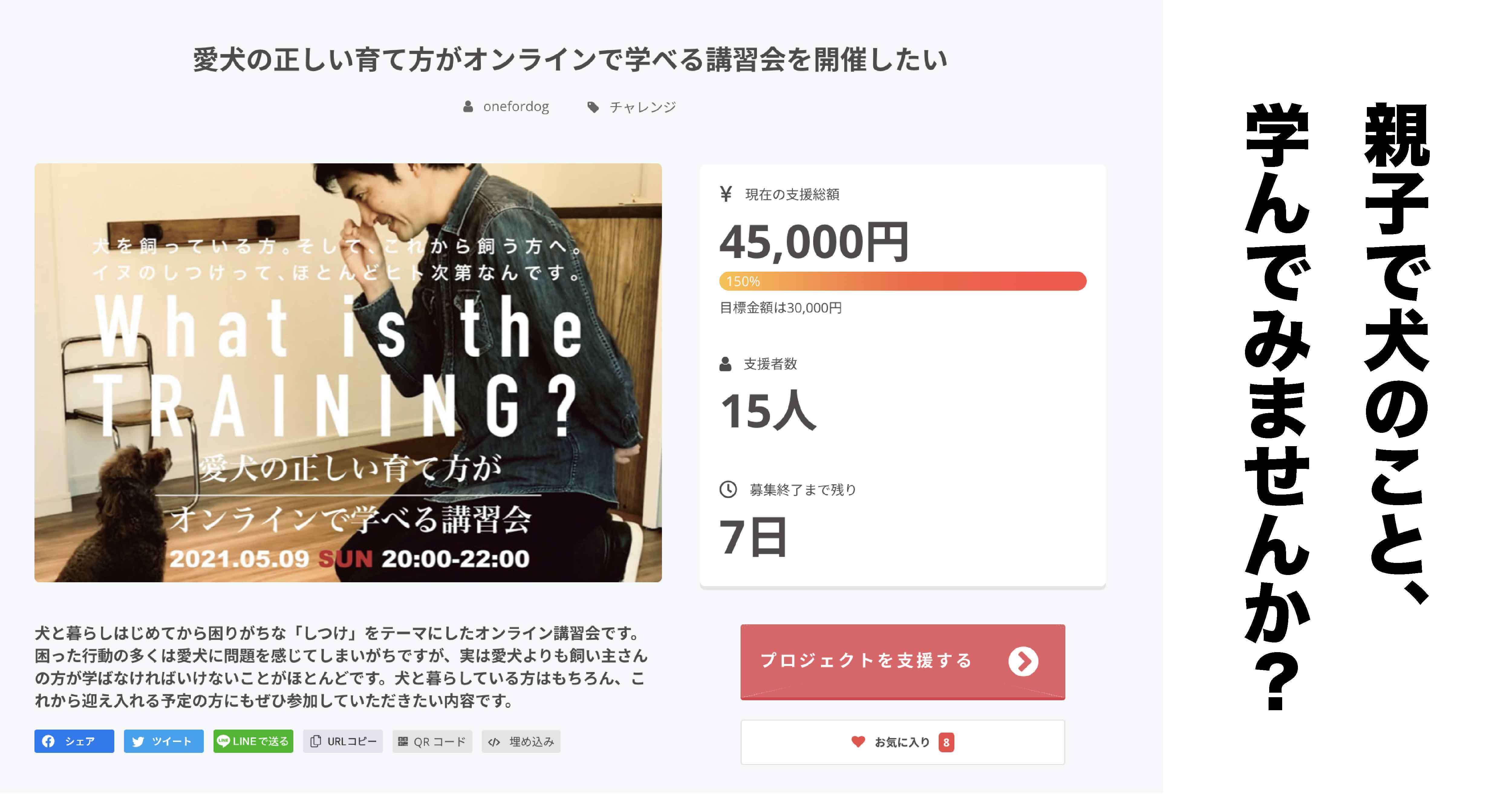 この度はOne for Dog のクラウドファンディング「愛犬の正しい育て方がオンラインで学べる講習会を開催したい」にご支援いただきありがとうございます。