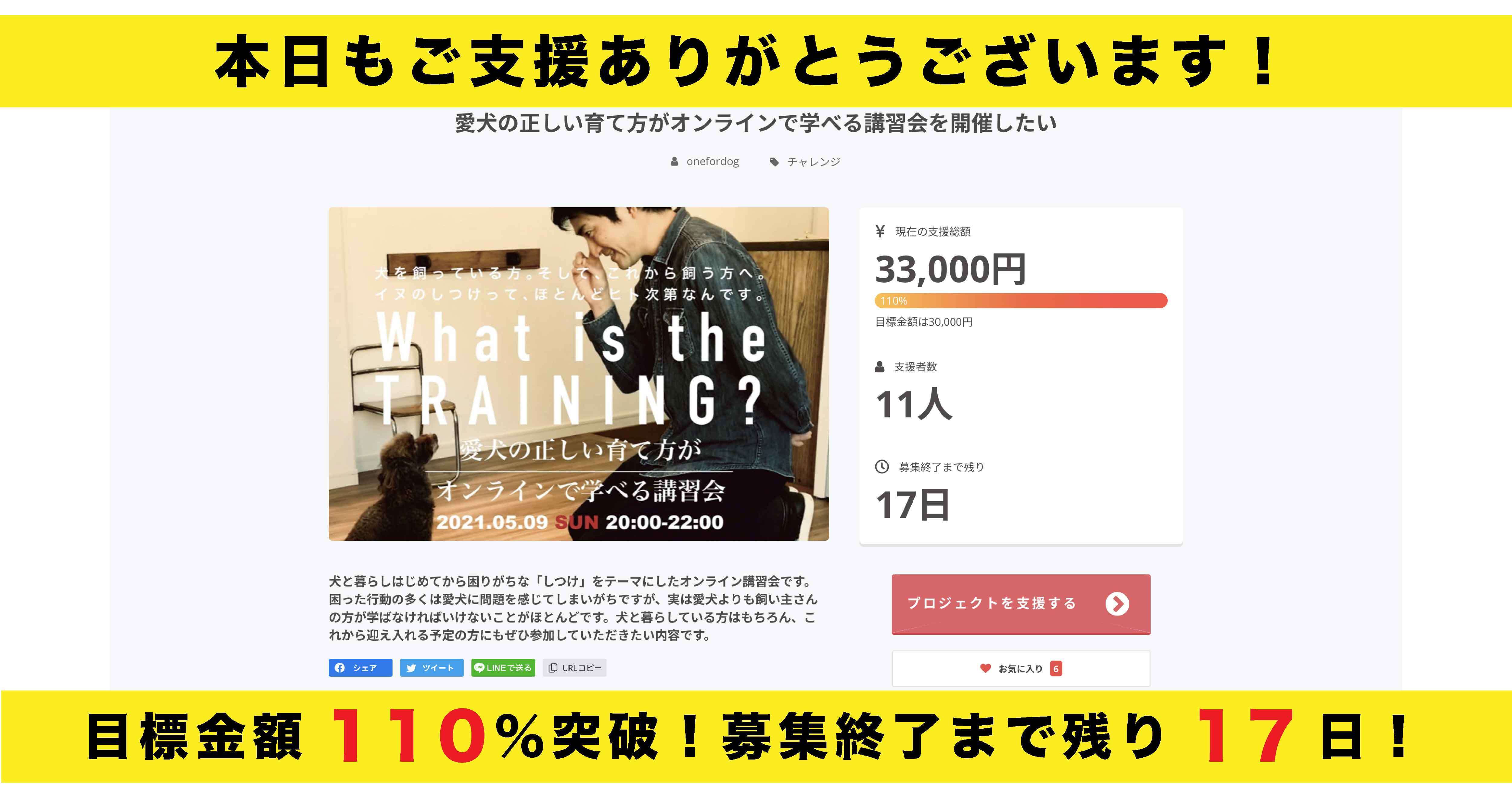 この度はOne for Dog のクラウドファンディング「愛犬の正しい育て方がオンラインで学べる講習会を開催したい」にご支援いただきありがとうございます。今回はしつけに関して「note」の記事をご紹介します。講習会のみならず今後の愛犬との暮らしに役立てていただけたら幸いです。「愛犬のしつけがオンラインで学べる講習会」僕はトリマーである一方、ドッグトレーナーの側面もあるどっちつかず男なのですが、今日はドッグトレーナーに軸足を置いてお話したいと思います。よく、「ウチの子、最近吠えるようになっちゃって」「昔はおとなしかったのに。。。」というご相談を受けます。しかし、犬たちは日々学習する動物です。仔犬であってもそれは然り。犬たちの行動一つ一つにはちゃんと意味があって、そのほとんどは学習による成果なんです。学習と言うとなんだか良いイメージですが、問題行動もまた学習から生まれたアイデアの一つです。かの有名な動物行動学者・イアンダンバー氏は次のような言葉を述べています。「仔犬の唯一の罪は、成長することです。」例えば、仔犬が家に来てから環境の変化に馴染むまで、うんともすんとも言わなかったとします。あまりにおとなしい仔犬を見て心配になった飼い主さんは、「ウチの子、他の犬みたいに全然吠えないけど大丈夫かしら。。。」と不安になります。それから間もなくして環境に馴染みはじめ、ようやく自分を出せるようになった愛犬が、ふと「キュンキュン」と鳴きました。それを聞いた飼い主さんは・・・?「かわいい!見て!吠えたよ!」と喜びますよね。すると、吠えることで反応してもらえた仔犬は「吠える=興味を持ってもらえる」と学習するわけです。しかし数カ月後、体も成長し声も大きくなったその子が同じように吠えると・・・「も~、うるさいよ!!」果たして愛犬は気付くでしょうか?「そうか!体も大きくなって声も大きくなって幼い鳴き方じゃなくなったから吠えたらダメなんだ!」と。そう、仔犬の成長は罪なんです。しかし、こんな結論は果たして正しいと言えるのでしょうか。私たちは愛犬の行動を見る時、ついつい人間の視点に立ってしまいがちです。しかし、そこには大きな誤解が生じていることを忘れてはいけません。「動物行動学」は科学的に犬の行動心理を分析しています。専門的すぎるゆえ理解しにくい学問を、もっと分かりやすい形で学んでみる。そのための授業を今回、オンライン講習会という形でご用意しました。それが昨日発表した「愛犬の正しい育て方がオンラインで学べる講習会」です。月齢や問題行動の有無に関わらず役立つ内容になっています。楽しみながらしつけを学べるよう間違い探しを使って”犬の気持ち”を解説していきます。この機会にご家族みんなで愛犬のことを理解してあげませんか?【現在の状況】支援総額 45,000円支援者数 15人お気に入り 8名まだまだ募集は継続していきますので、リターンに関してなどご不明な点がございましたら、「コメント」欄等でお問い合わせください。今後とも宜しくお願いいたします!One for Dog齋藤 大