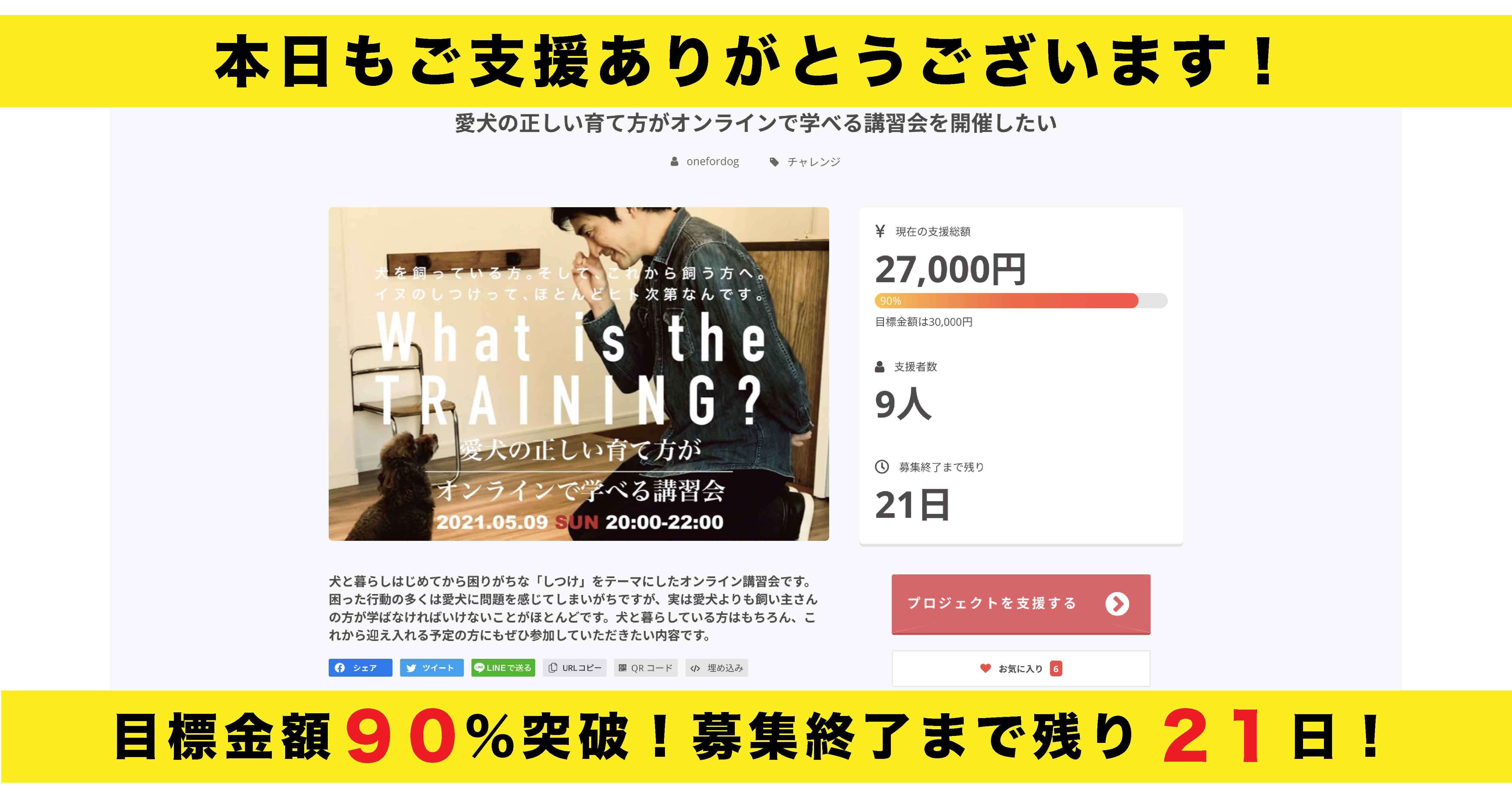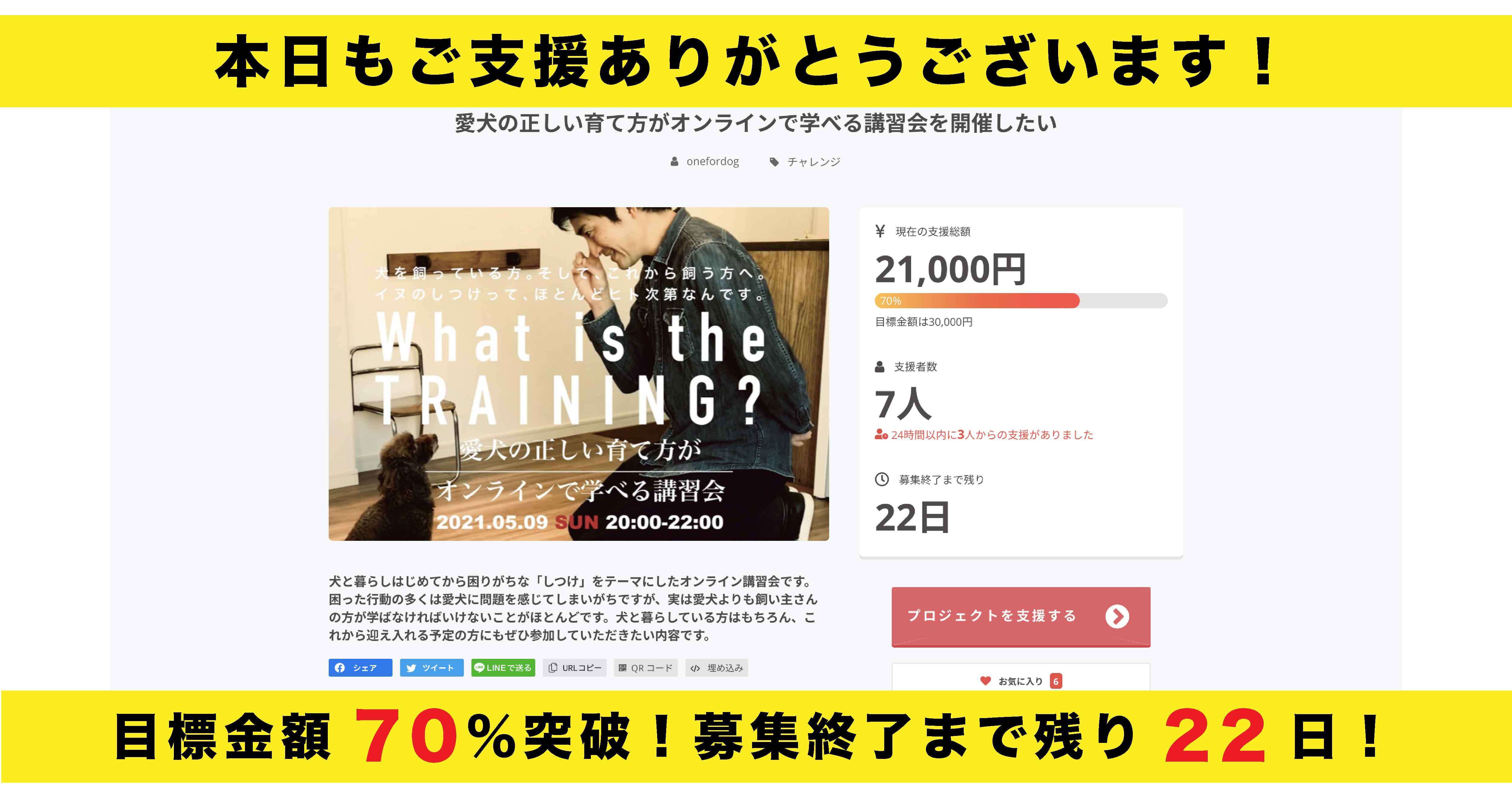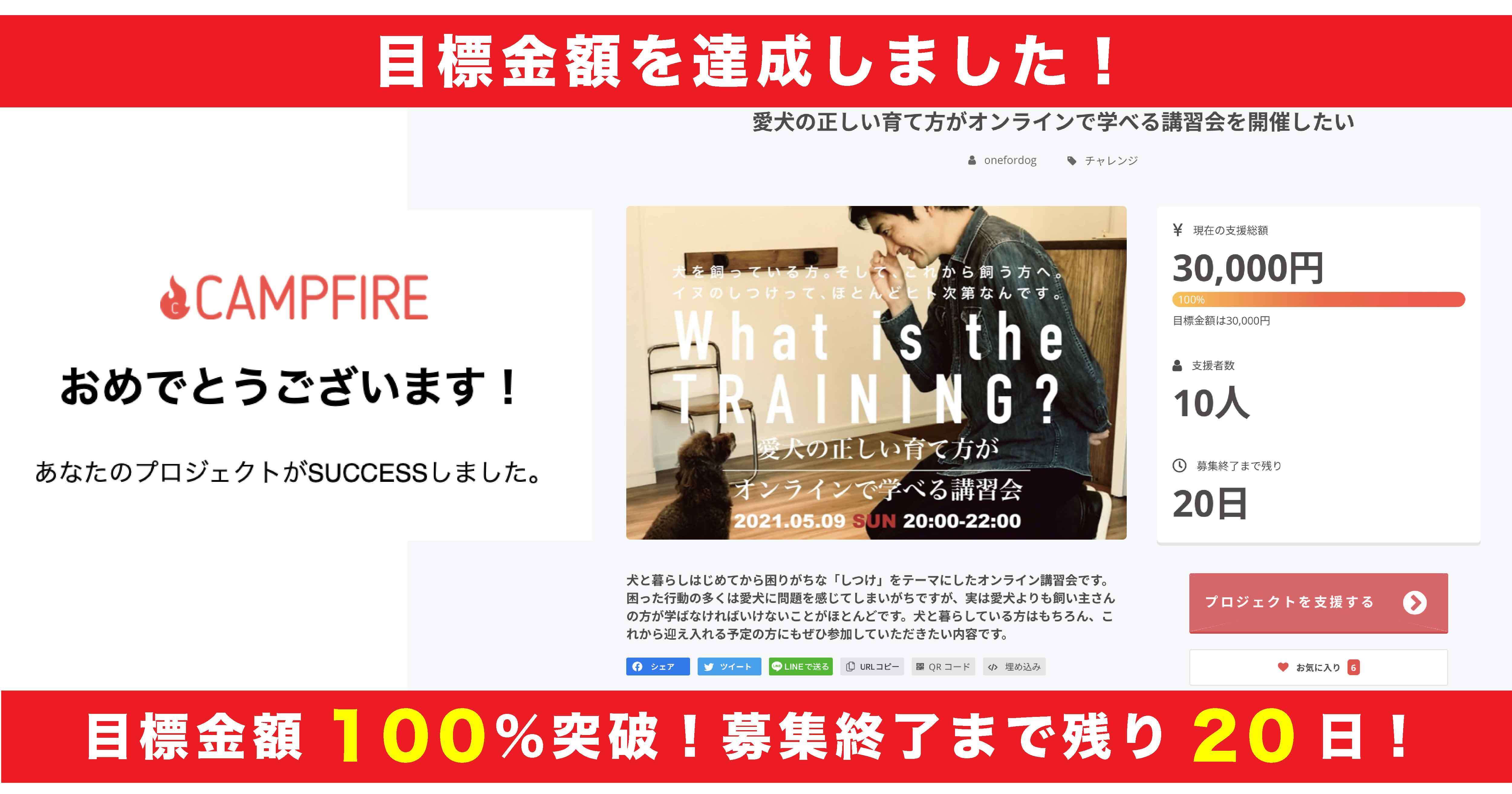 この度はOne for Dog のクラウドファンディング「愛犬の正しい育て方がオンラインで学べる講習会を開催したい」にご支援いただきありがとうございます!本日、無事目標金額を達成することが出来ました!ご支援いただいた皆さま、本当にありがとうございます!前回のプロジェクトに引き続き、第2弾もSUCCESSさせていただいたこと、心より感謝申し上げます。ということで、All-or-Nothing方式によりお約束どおり講演会を開催致します!明日からも講習会の募集は継続しておりますので、愛犬のしつけにご興味のある方は是非ご検討くださいませ。その他リターンに関してなどご不明な点がございましたら、「コメント」欄等でお問い合わせください。ご参加お待ちしております!【現在の状況】支援総額 30,000円支援者数 10人お気に入り登録 6名One for Dog齋藤 大