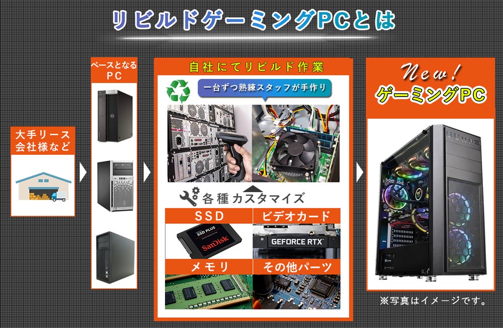 大手企業などがリース契約で一定期間(2年程度)使用し回収された高性能パソコンをベースに、グラフィックボードなどの専用部品を搭載したり、消耗部品(SSDなど)を新品に交換したり、ゲームが快適にプレイするできる性能まで、大幅に性能を増強します。