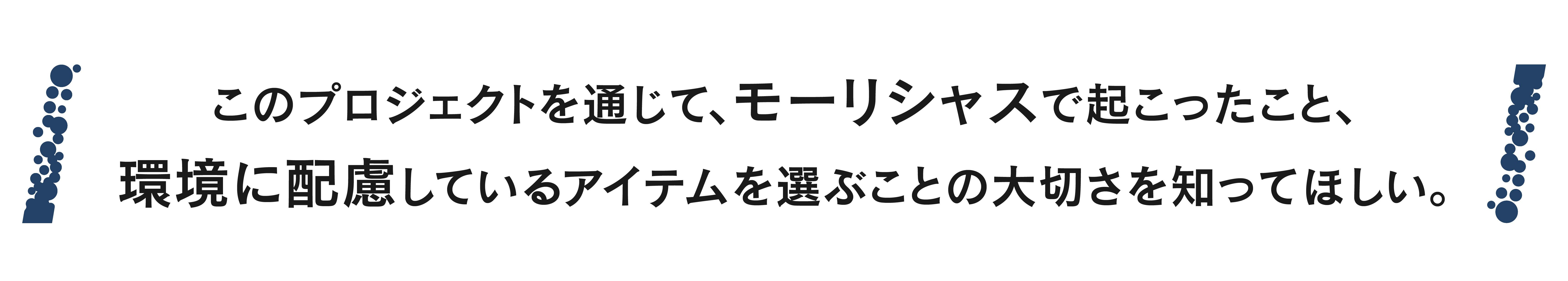 そしてこの活動を、モーリシャスにとって重要な主要産業であるファッションを通じて行うことにより、今までモーリシャスの事を知らなかった方々や、支援の方法を探していた方々に幅広く認知して頂くことができると考えています。毎日着るTシャツや毎日使うエコバックを通して、モーリシャスの海、コロナや座礁事故を乗り越えようと頑張っている方々に、遠く離れた日本から想いを馳せ、支えあう素晴らしい関係が築ければと願っています。