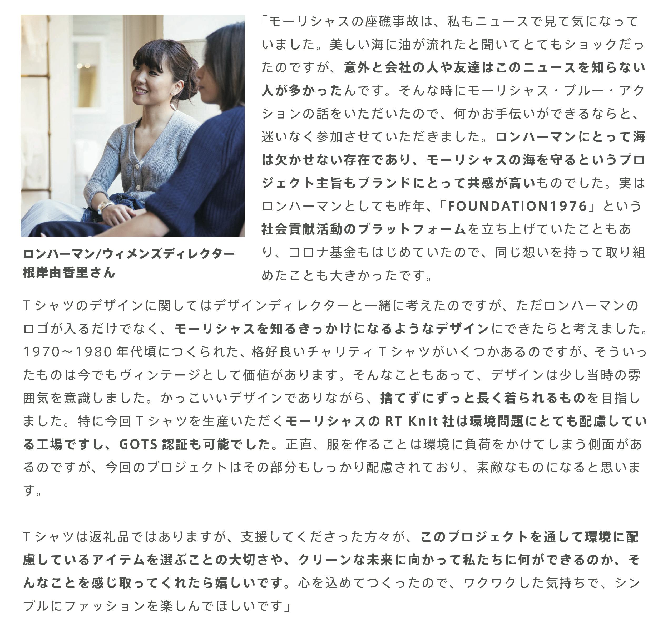モーリシャスの主要産業である繊維産業への貢献と、収益の一部を寄付することで、モーリシャスの観光業や漁業、海洋資源への支援に寄与することを目指す。そんな思いに真っ先に賛同してくれたのはロンハーマンのウィメンズディレクターである根岸由香里さんでした。モーリシャス・ブルー・アクションに対する想いや、Tシャツに込めた想いなどをコメントいただきました。