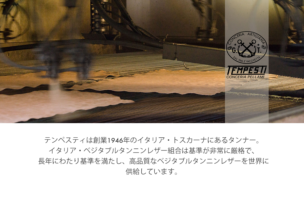 トスカーナ地方で製造される植物タンニンなめしのレザーは、1200年頃から受け継がれる伝統的手法でなめされた革です。使うほどに馴染み、艶や風合いが増すのが特徴です。