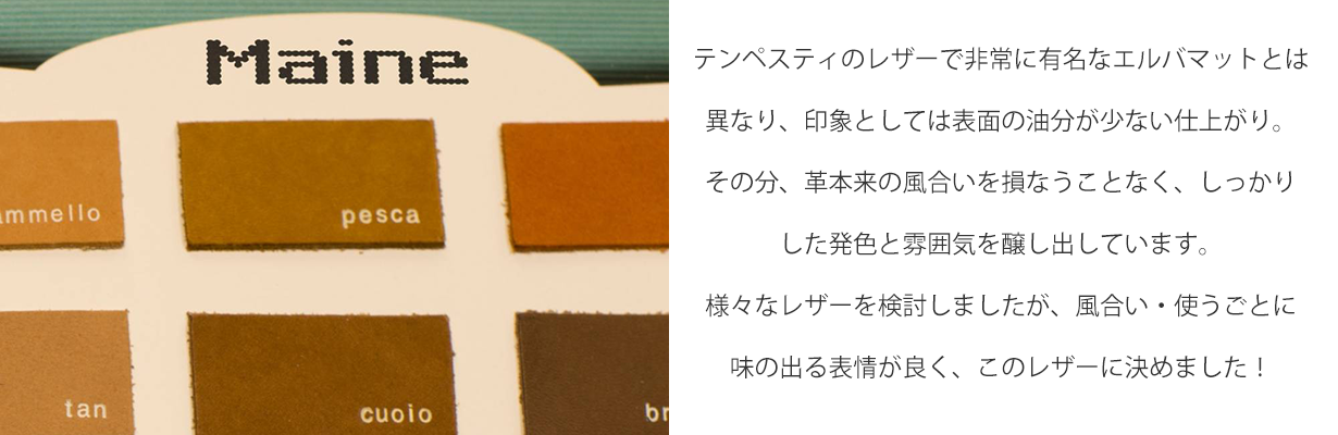 Maineの特徴は、表面が少しさらさらしたような状態ですが、使うごとに艶・色の深みが増すレザーです。クリームなどでお手入れをしていただくと、より素晴らしい表情が出ます。
