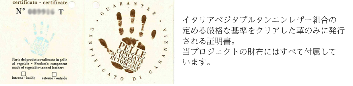また、イタリアベジタブルタンニンレザー組合の基準は厳しく、基準を通過したレザーには、すべて革のシリアルナンバー入りの証明書が付属いたします。