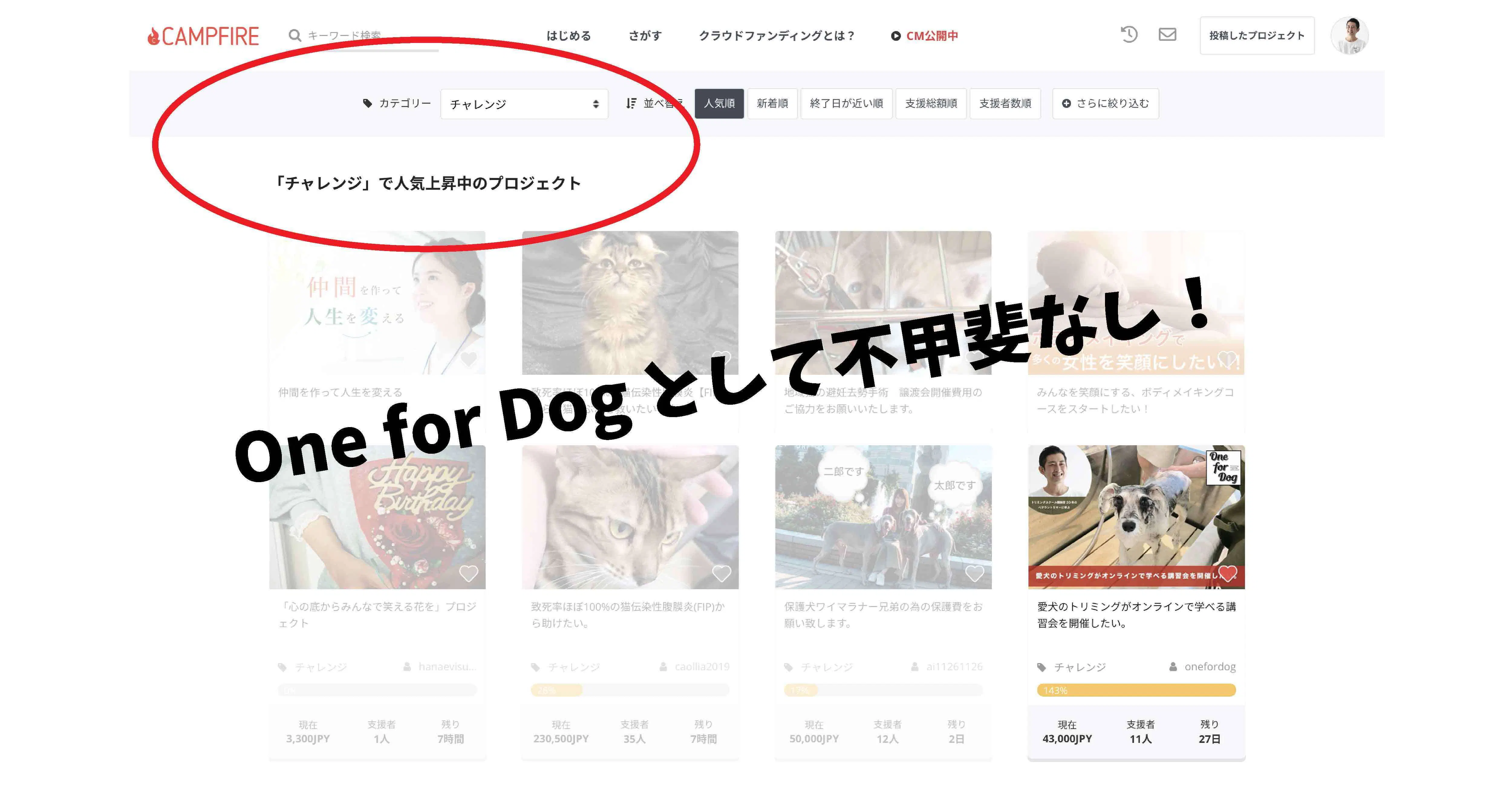 今回One for Dogのプロジェクトは「チャレンジ」というカテゴリで掲載されています。