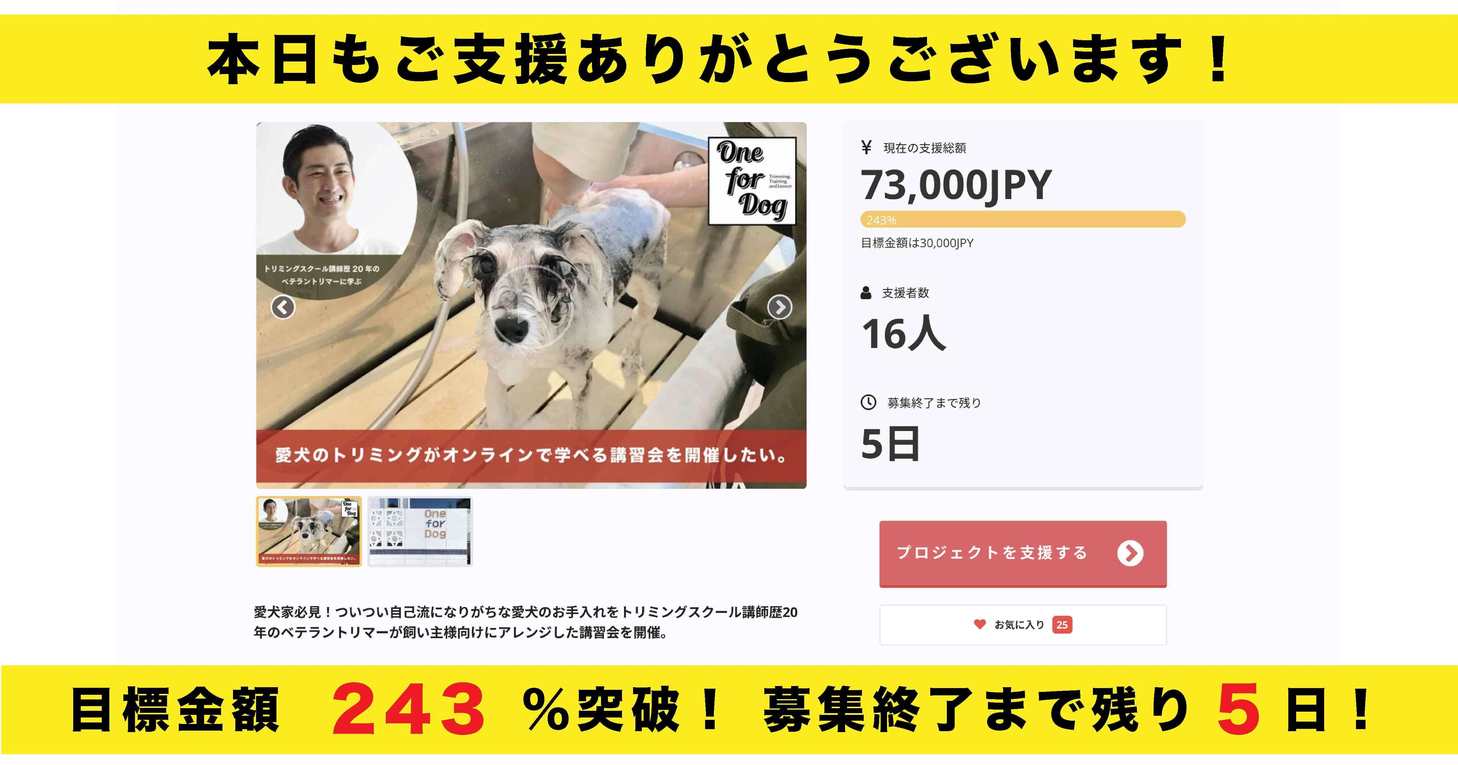 この度はOne for Dog のクラウドファンディング「"愛犬のトリミングがオンラインで学べる講習会"を開催したい。」にご支援いただきありがとうございます!