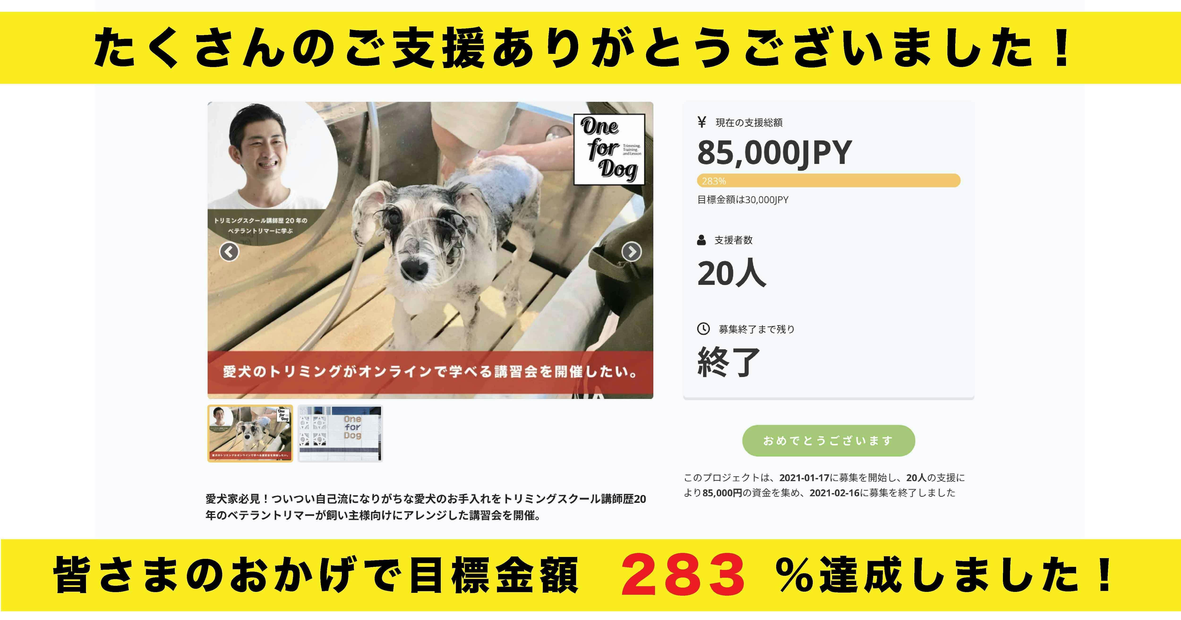 この度はOne for Dog のクラウドファンディング「"愛犬のトリミングがオンラインで学べる講習会"を開催したい。」にご支援いただきありがとうございました!