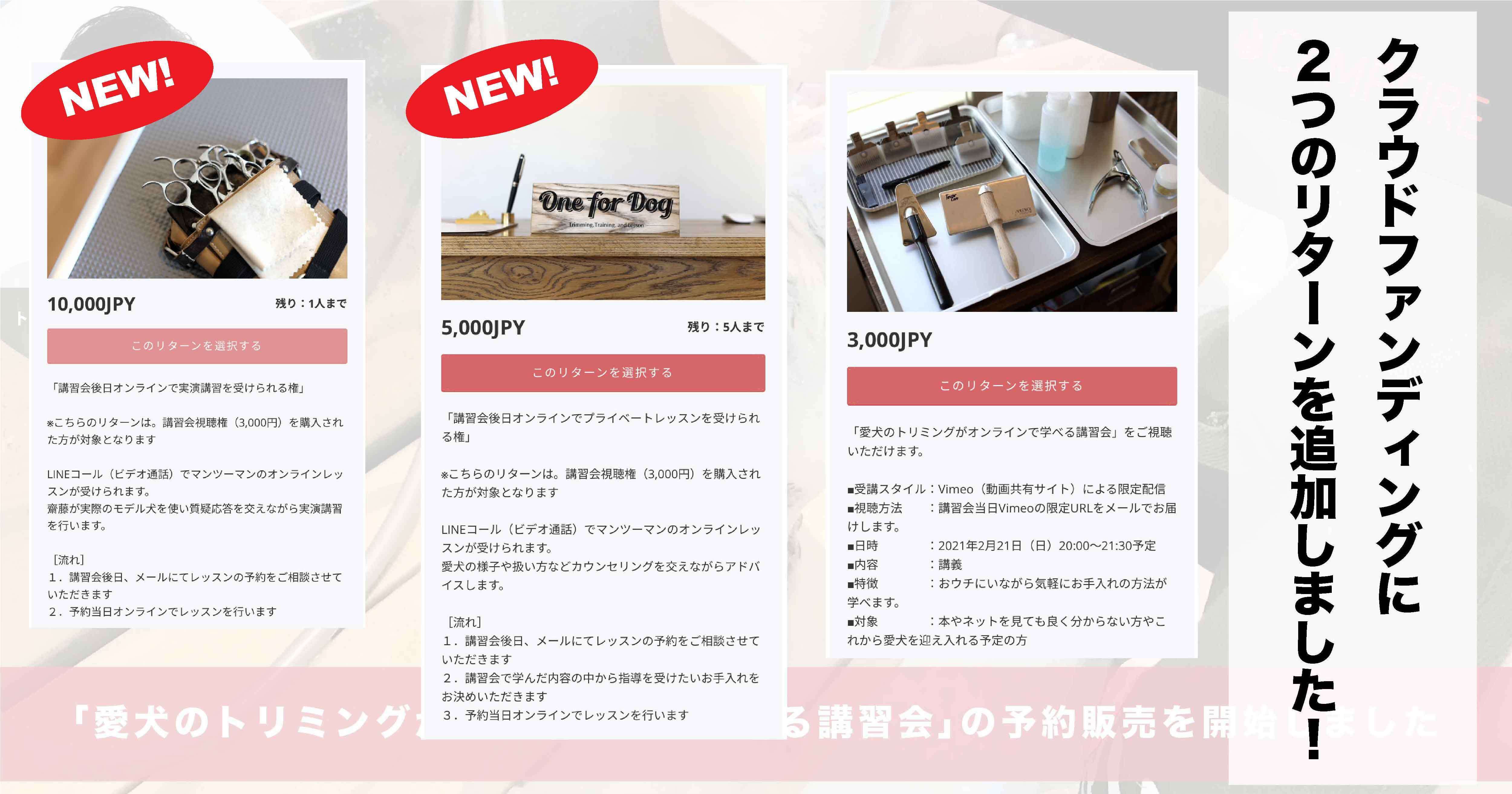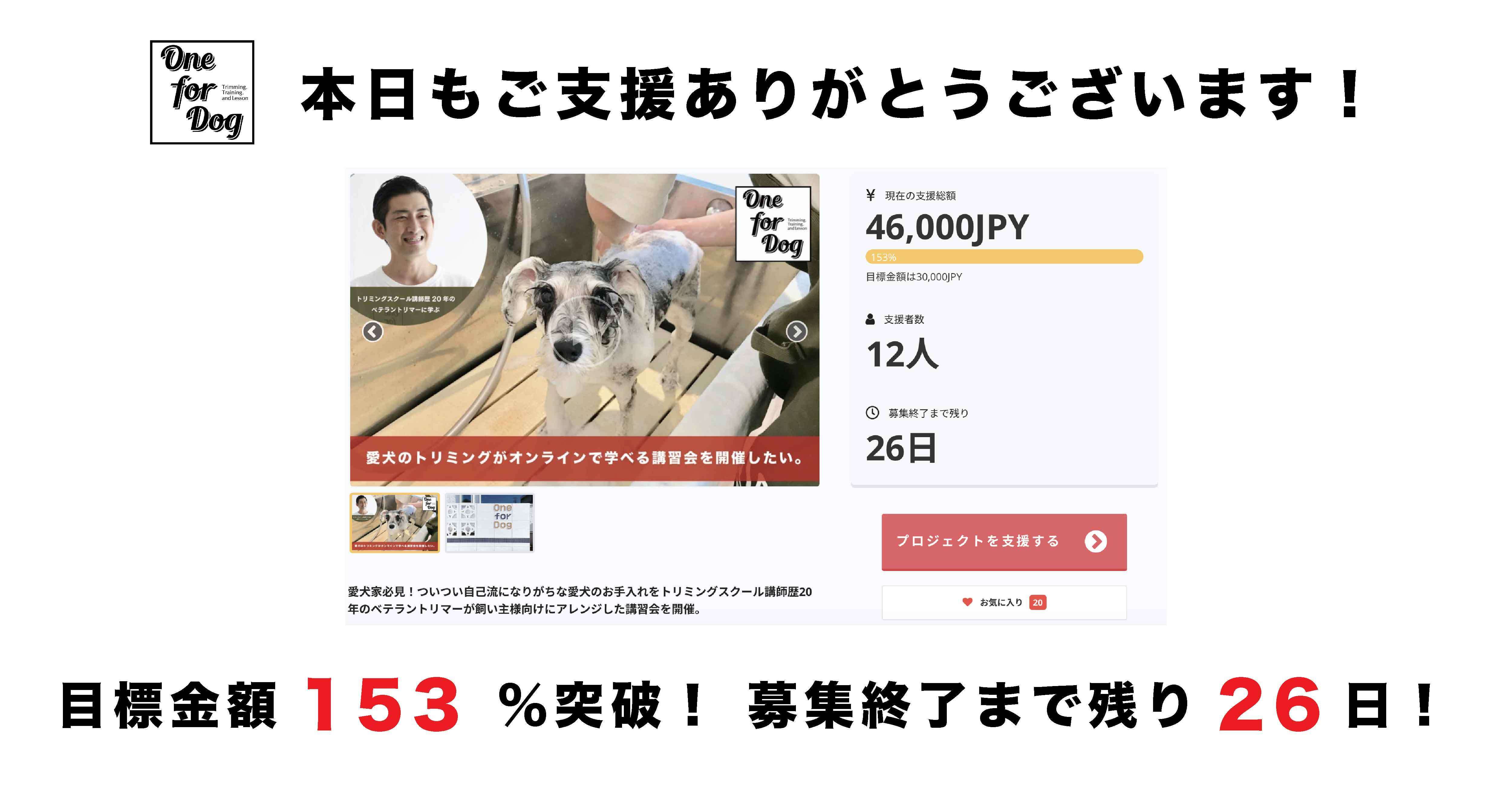 この度はOne for Dog のクラウドファンディング「"愛犬のトリミングがオンラインで学べる講習会"を開催したい。」にご支援いただきありがとうございます!【現在の状況】支援総額 46,000円支援者数 12人お気に入り 20名おかげさまで公開日以降、たくさんの皆さまにご支援いただいております。本当にありがとうございます!まだまだ募集は継続していきますので、リターンに関してなどご不明な点がございましたら、「コメント」欄等でお問い合わせください。今後とも宜しくお願いいたします!One for Dog齋藤 大