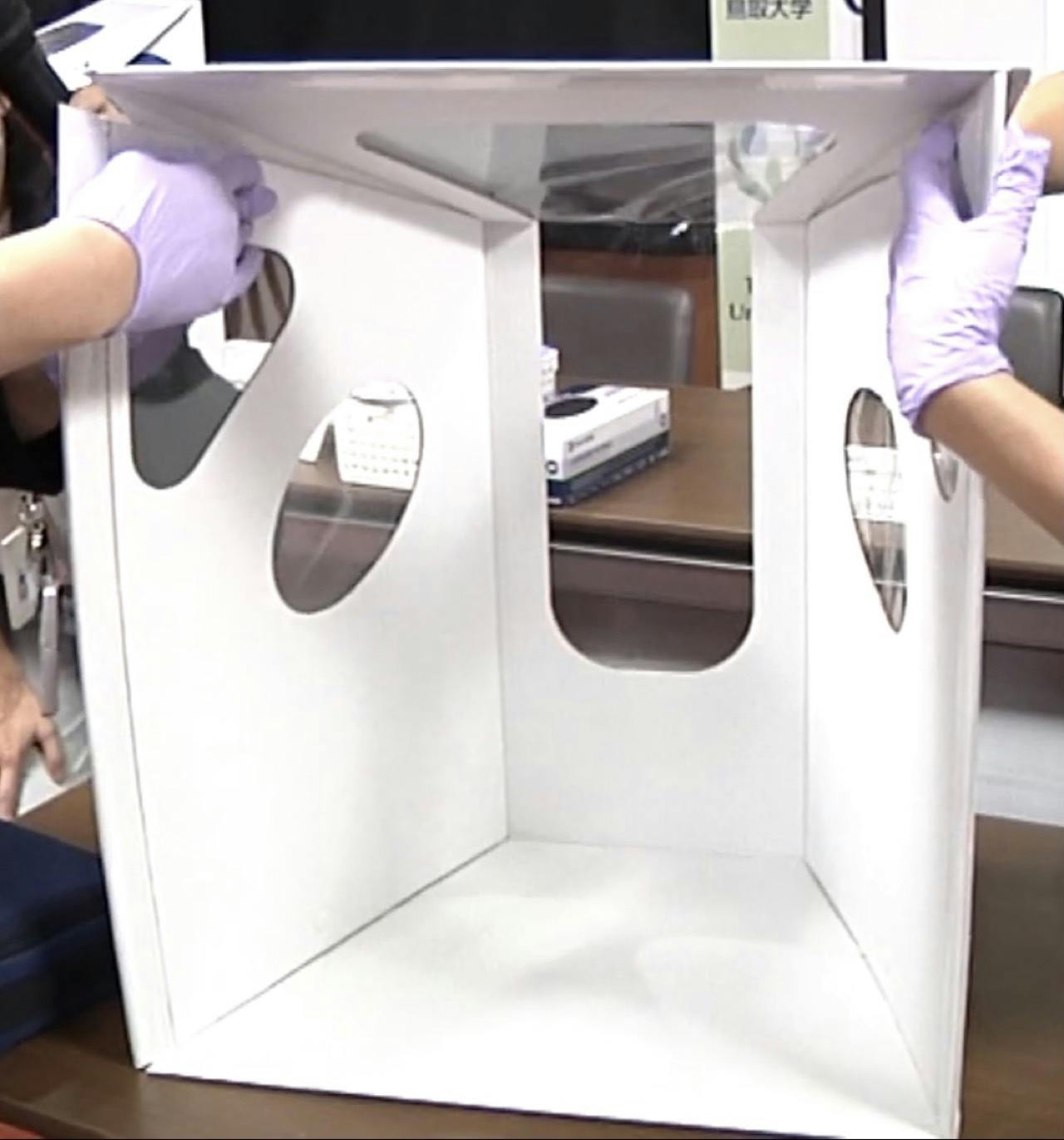 中海・宍道湖・大山圏域の産学医工連携事業で開発された、『世界初の使い捨て“飛沫防止ボックス“』で少しでも多くの医療従事者の役に立つことができるのではないかと考えました。
