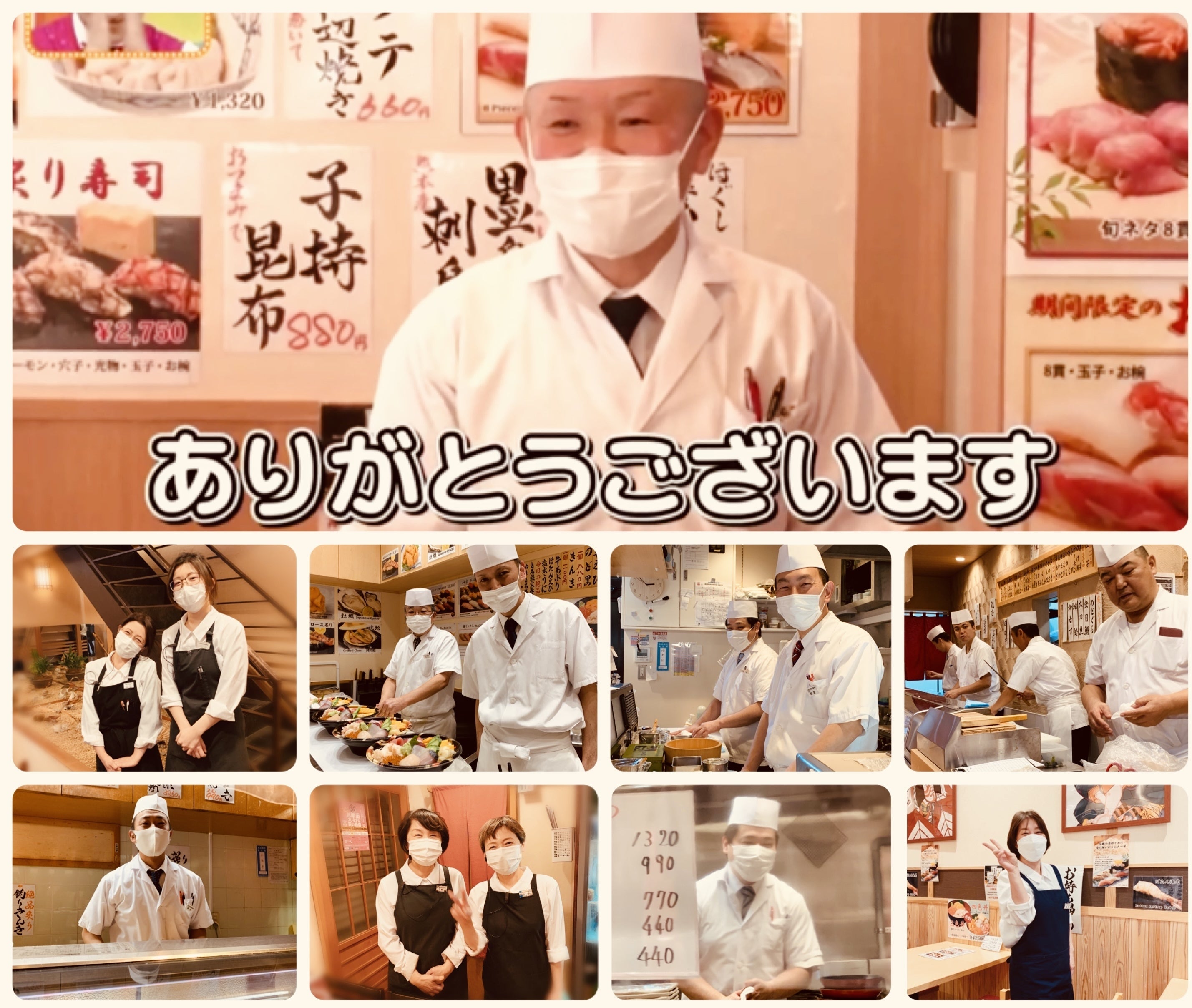 写真は、つきぢ神楽寿司の仲間の一部です。その他のスタッフ全員含め、つきぢ神楽寿司一同、これからも一層頑張ります!