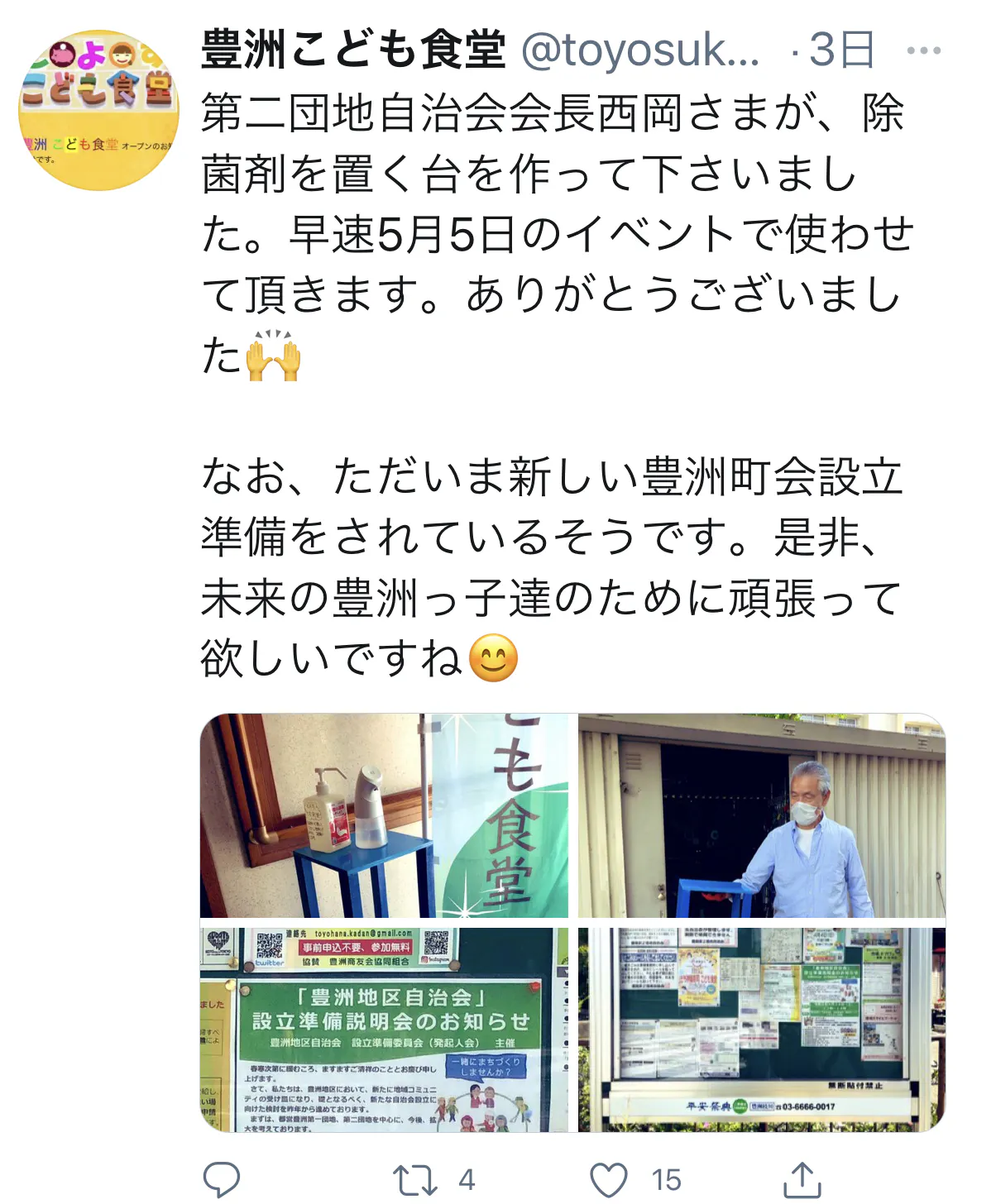 第二団地自治会会長西岡さまが、除菌剤を置く台を作って下さいました。早速5月5日のイベントで使わせて頂きます。ありがとうございました。