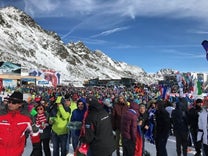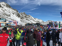 ‐スキー場のふもとに屋台やパネル、モニター、観客席が用意され、音楽とDJの司会とともにコースの周りに多くの人が集まっての観戦。
