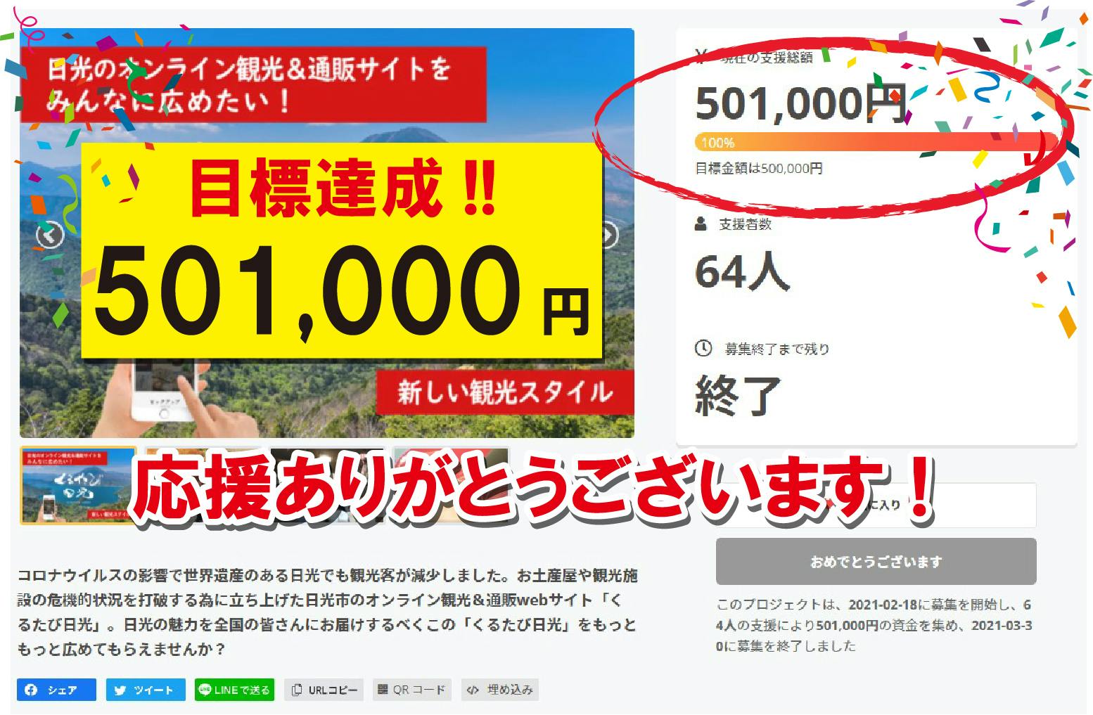 目標金額も達成でき、「くるたび日光」を多くの方々に知っていただけ、心より感謝申し上げます。