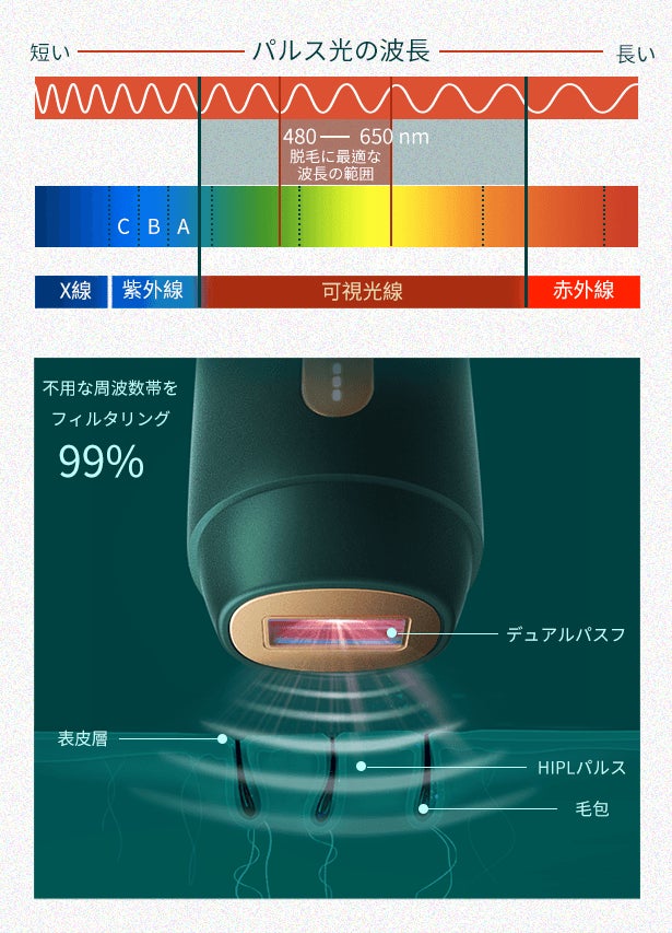 サロン級IPLパルス技術は、サロンや美容外科で採用されている痛みと刺激が少ない美肌技術です。IPLはムダ毛の毛根に含まれるメラニン色素に働きかけます。ムダ毛は毛根が弱って自然に抜け落ち、同時に毛の成長サイクルも抑制されます。
