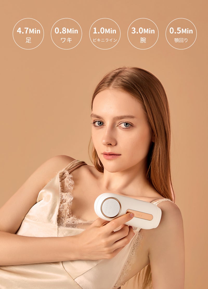 自動連続モードの照射間隔は最速で0.9秒。わずか10分で全身のお手入れが完了し、より効率的です。痛みが少なく照射面積も広いので、処理に時間がかからず、操作もボタンを押すだけですので、初めての方でも簡単にお使いいただけます。