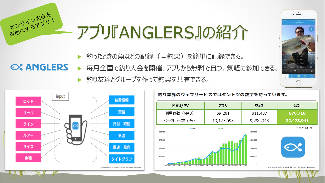 コロナ禍の中でも密になることなく開催するための手段として、釣果情報を共有できるSNSアプリ「ANGLERS(アングラーズ)」を利用した大会とします。場所と大会日を限定しない為、全国で大会期間中都合の良い日に参加いただけます。