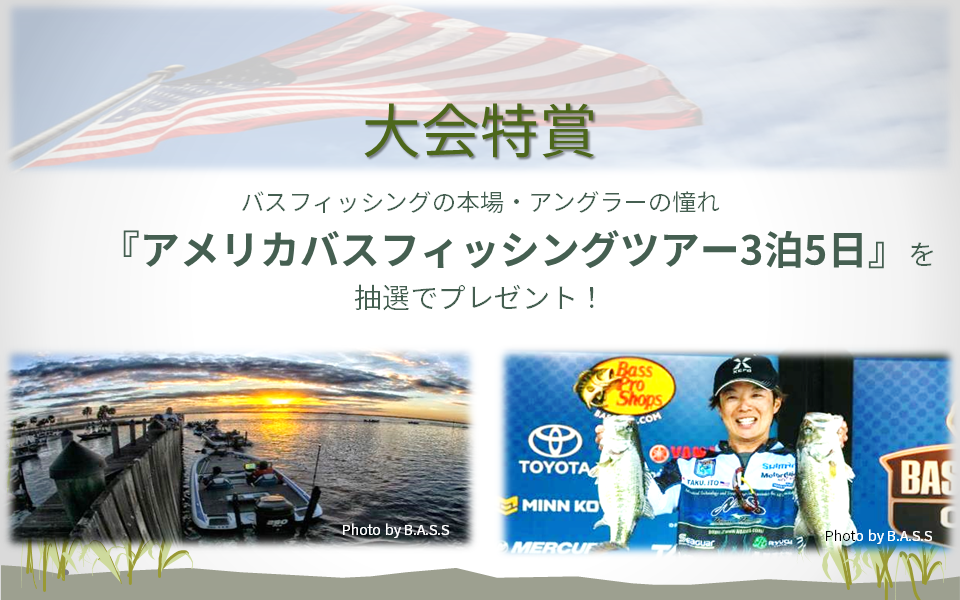 旅行会社ならではの特賞として『アメリカバスフィッシングツアー3泊5日』を用意。しかも、現地ガイドとして世界最高峰のトーナメント”バスマスターエリートシリーズ”で戦っている伊藤巧プロと同船釣行していただけます。