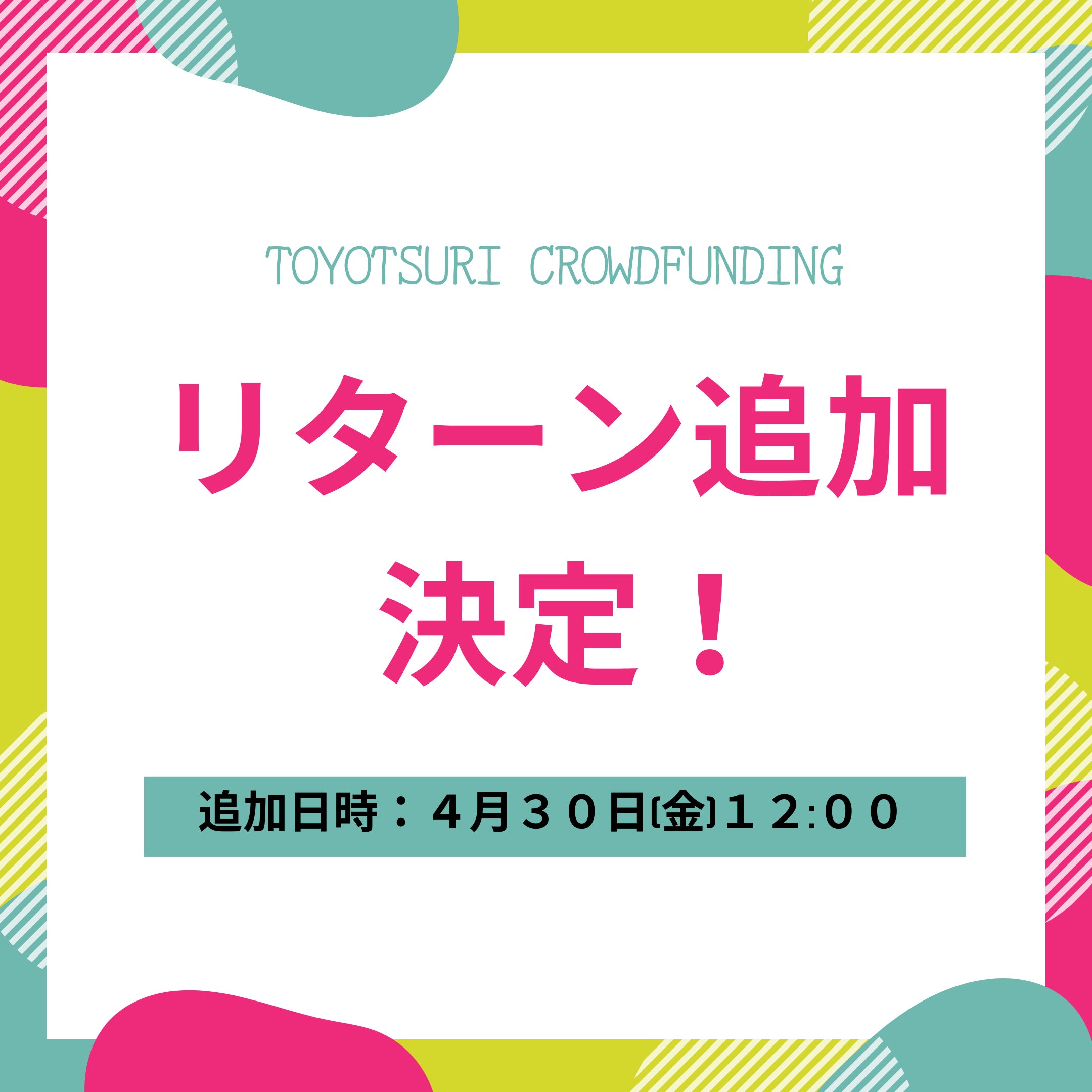 上記のリターン追加日時は4月30日(金)12:00からです。