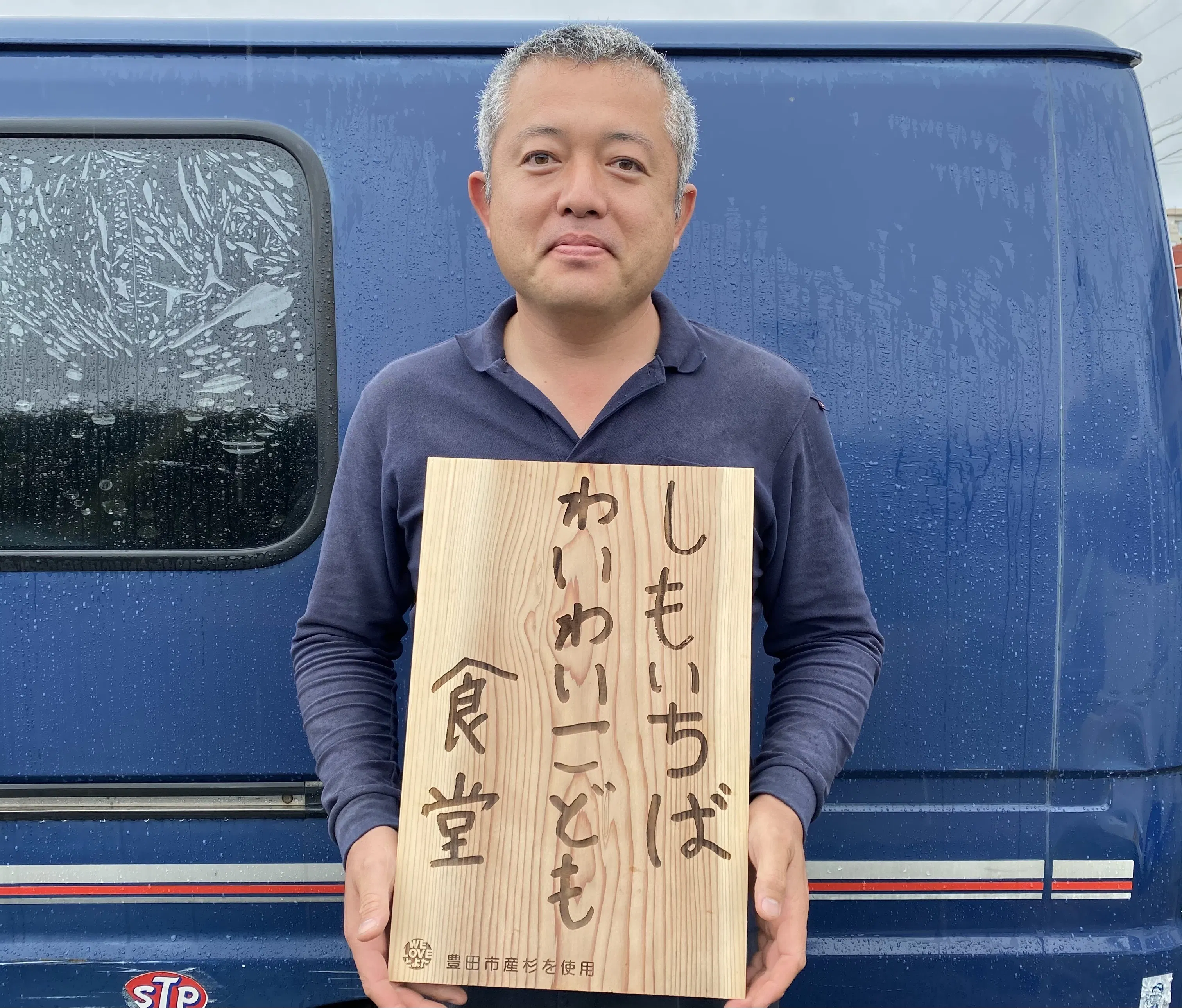 森林組合の山田さんにこども食堂の看板を作ってもらいました。