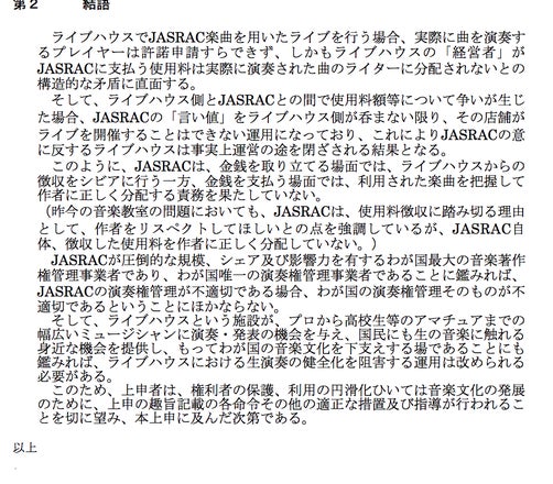 そして、ライブハウスという施設が、プロから高校生等のアマチュアまでの幅広いミュージシャンに演奏・発表の機会を与え、国民にも生の音楽に触れる身近な機会を提供し、もってわが国の音楽文化を下支えする場であることにも鑑みれば、ライブハウスにおける生演奏の健全化を阻害する運用は改められる必要がある。