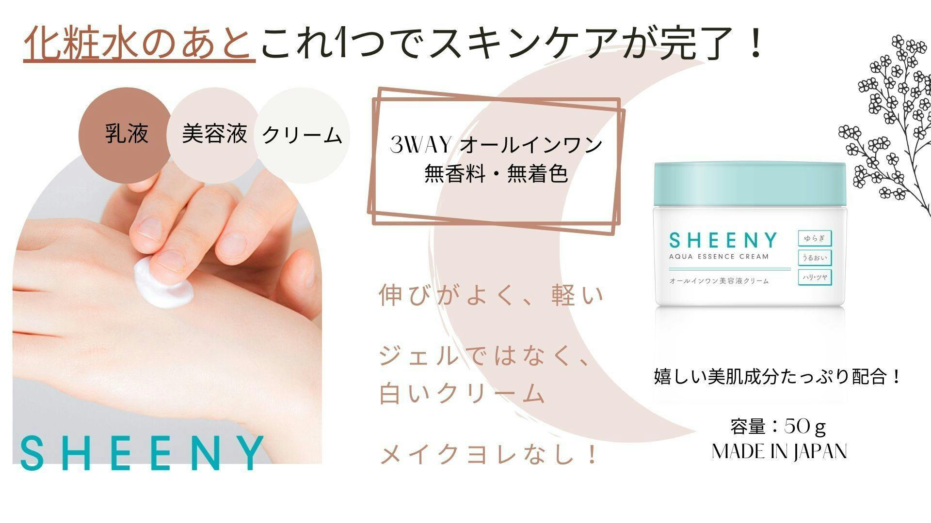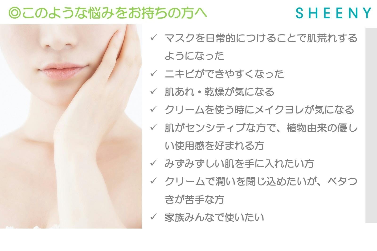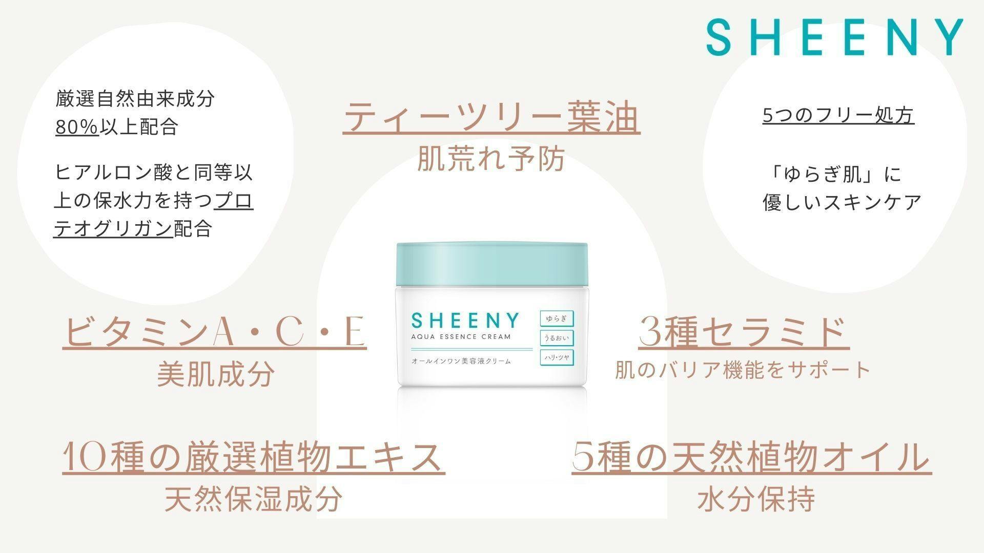 2021/01/20 08:38マスクの着用が日常化し、肌が敏感になり、乾燥、トラブル、弾力低下、アレルギーなど肌の悩みを訴える人も増えたと言われています。これにスキンケア製品の中でも「無添加」、「肌にやさしい」製品とシカなど肌の鎮静とトラブルケアに役立つ成分が含まれた製品が好まれると思います。些細なトラブルから始まる肌の老化を防ぐためには、自然由来成分の低刺激化粧品を活用して敏感になったマスクゾーンのケアに力を入れなければなりません。シーニーはこのような肌荒れに優しいクリームとして開発しました。まず、特徴として抗菌や鎮静作用のあるティーツリーオイルを配合しました。ティーツリーはオーストラリアの湿地帯に生育する植物。昔から傷、肌トラブルのケアをしてくれる自然の恵みとして使われました。ティーツリーには抗菌作用と抗真菌作用があるため、ニキビなどの肌荒れの予防にも期待できます。SHEENYシーニーアクアエッセンスクリームは、ゆらぎ肌に鎮静、保湿→ダブルケアができる製品です。 ティーツリー以外にもマスクで息苦しく刺激を受けた肌に簡単かつ素早く鎮静・保湿効果を与える50種類くらいの美容成分、自然成分が豊富に含まれており、健康な肌の維持に役立ちます。 エイジングケアのためにレチノール(ビタミンA誘導体)このビタミンA誘導体は、肌を引き締め、ハリを与え、肌のコンディションを高めるといわれています。 ビタミンC誘導体+ビタミンEコラーゲン生成に働くビタミンCは、美肌を維持する成分。抗酸化作用のあるビタミンA、血行を促すビタミンEの相乗効果でさらに力を発揮します。アロエベラエキスアロエの歴史はとても古く、昔から生薬として使われており、「うるおい・弾力のある肌へ導く美肌効果」が期待されます。厳選3種のセラミドセラミドは肌の保湿には欠かせない成分で、 肌荒れやカサつきをケアしてくれます。さらに東洋を代表する鎮静成分ツボクサエキス(シカ)、天然成分で保湿・保護効果の高いワセリン、肌荒れ防止効果があるユーカリエキス、肌荒れを防いだり、ハリや弾力をUPさせるなどの美肌効果が期待できるアーチチョーク葉エキス、肌荒れを防いで、 なめらかで輝きのある肌に整えるカミツレ葉エキス、肌荒れ対策として人気のハトムギエキス、抗炎症、肌荒れやニキビ予防、抗アレルギーに用いられる甘草根エキスなど 肌荒れの場合、実は乾燥の問題もありますので、保湿をきちんと行うことでバランスが整い、改善が期待できます。 もっと見る