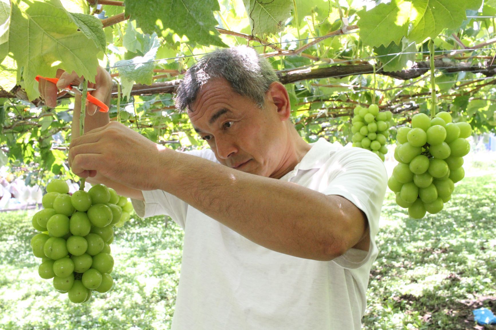 実ったぶどうを収穫する。収穫したぶどうの房から未熟果・病気果を切除する。