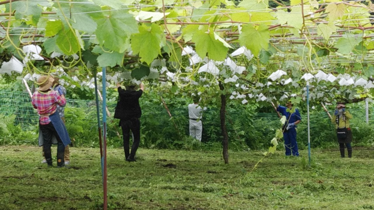 余分な房を切除する。 残った房に多く栄養が回るようにし、美味しいぶどうにする。新梢の成長を止め、果実に栄養が回るようにする。