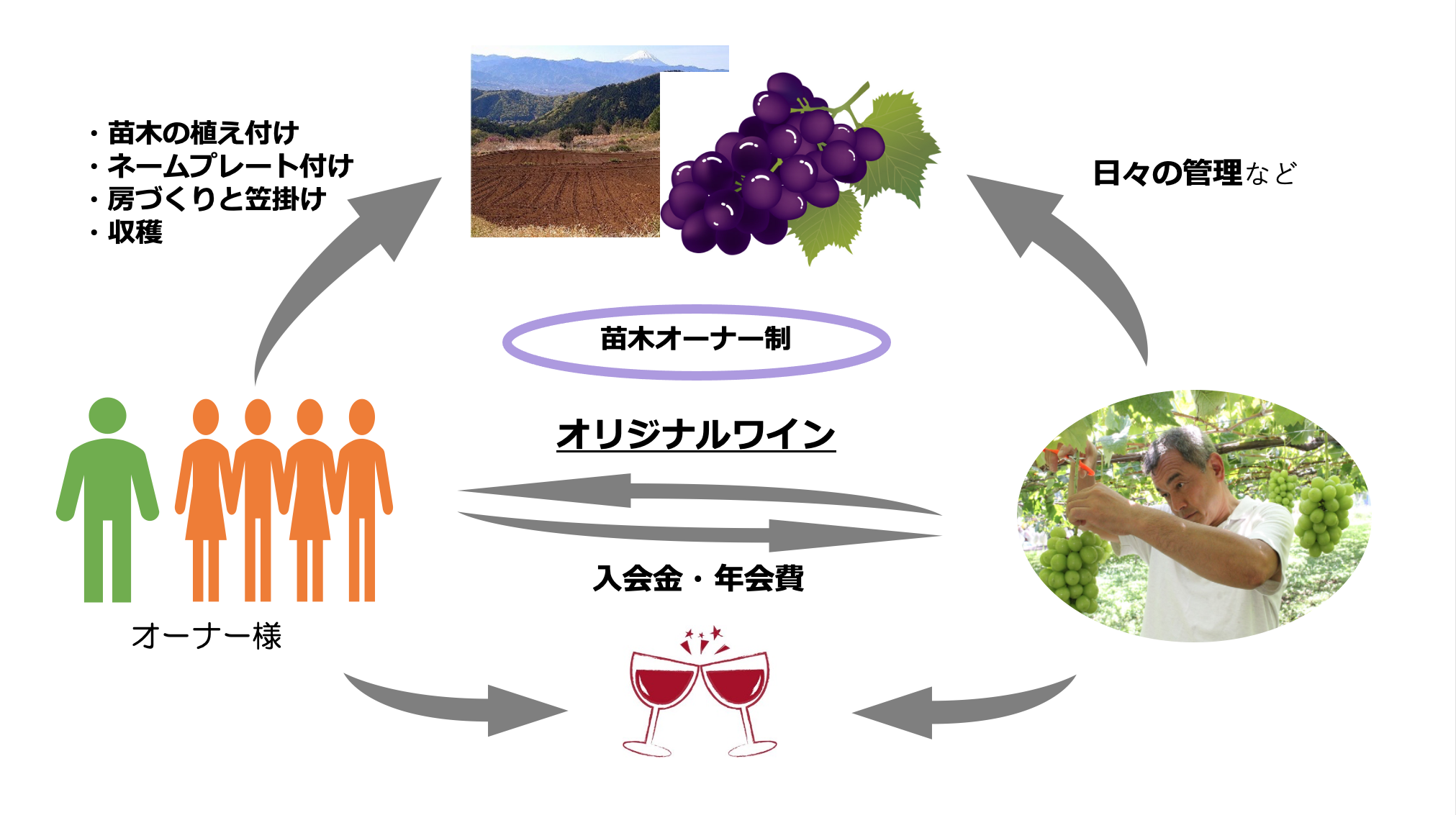 コロナ禍の中、酒類提供禁止、外出自粛等、外部環境に左右され、多くの製品在庫を抱え、大変厳しい状況下に置かれております。そんな状況下で、ワインを飲むだけでなく、ユーザー様と共に「造り上げていく手段はないか」と計画した事業です。苗木オーナー制度を通して、「共に汗をかき、充実感、無念さ、感動、喜び」を味わい、最後は、みな笑顔でオリジナルワインを手に取り、乾杯しましょう!!