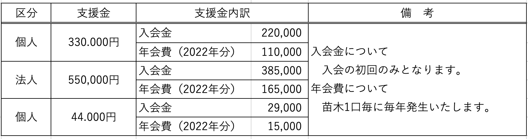 苗木オーナー支援金額(1口について)