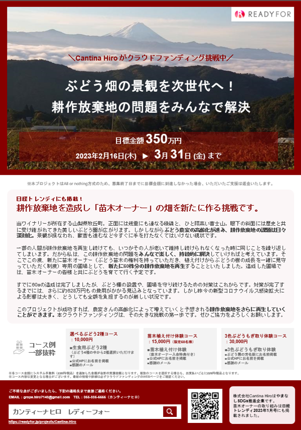 2回目の挑戦では、ぶどう苗木のオーナー様を募集し、オンリーワンのワインをお届けするためのクラウドファンディングを行います!!