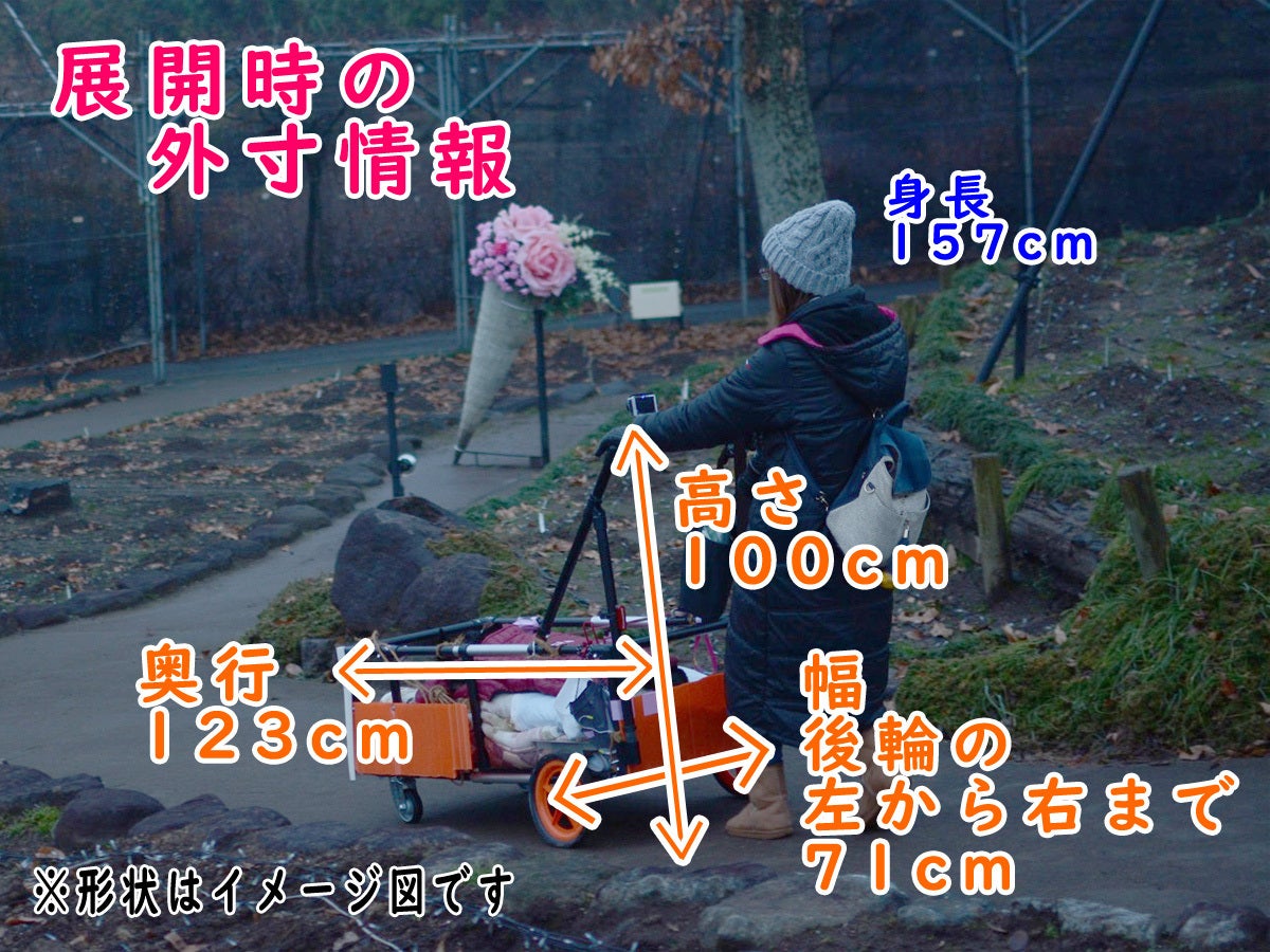 展開時の外寸:奥行123cm x 幅71cm x 高さ100cm(タイヤとハンドル含む)