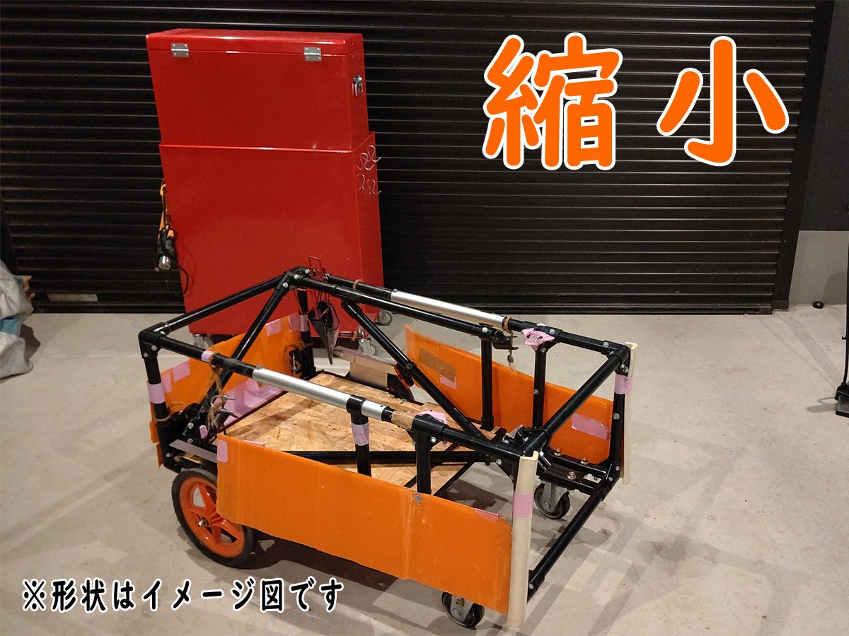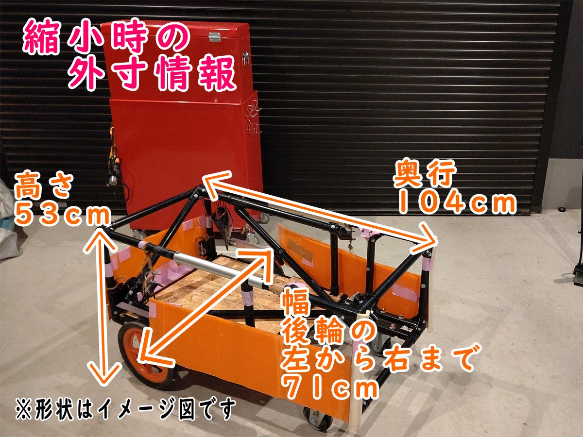 縮小時の外寸:奥行104cm x 幅71cm x 高さ53cm(タイヤ含む)