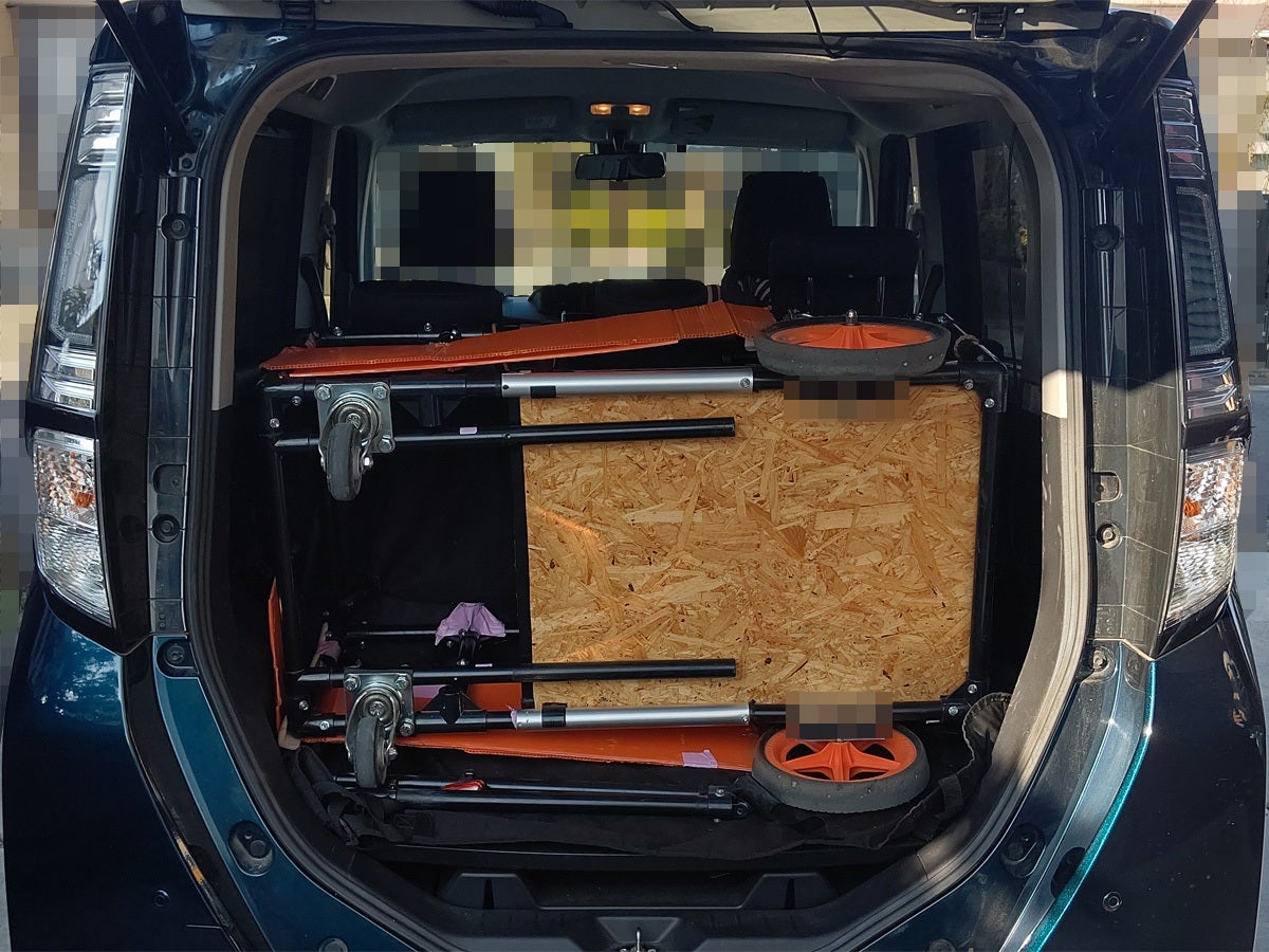 A2. 車にもよりますが、座席をたおしていただくなど、ある程度人間の我慢は必要になるかもしれません。我が家の車(ダイハツ・トール)には、後部座席の微調整だけでトランクに収まりました(添付写真を参照)。
