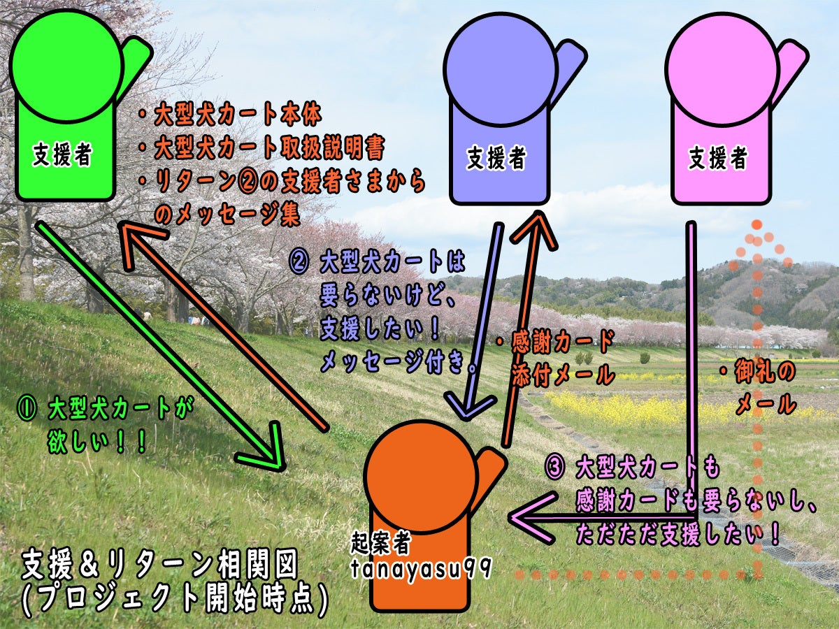 2021/01/07 16:45おはようございます!こんにちは!こんばんわ!お疲れ様です!tanayasu99(たなやす)です。ついに、プロジェクト公開となりました。審査してくださった担当者さま(関係各位さま)、お忙しい所早急にご対応いただき、誠にありがとうございました。そして、内容の事前確認、現行カートの試し乗りに、ご協力いただきました方々にも、あらためまして、感謝申し上げます。ありがとうございました。さて、公開とはなりましたが、この内容でどこまで『世間の皆様の目に留まるのか』という不安でいっぱいです。いくら天下に名高いCAMPFIRE様と言えども...内容によりけりでしょ(´・ω・)(・ω・`)ネープロジェクトの内容からすれば、犬好きな人達に見てもらって、拡散してもらいたいです。(他力本願かよ(*`Д´)=Э)>ДT)イテェ-)大型犬カートは要らないけど、個性的なカートだし、必要な人に渡ると良いなぁ~って思ったら支援お願いします。大型犬カート本体が欲しいという方も是非。プロジェクト本文にも載せている支援とリターンの相関図ですが、参考までに載せておきます。ひとつアピールするなら「奥行内寸が大きめ」ということです。ジャーマンシェパードの伏せた長さに合わせたので、市販カートではちょっと...ってなった背景が当時はありました。以上、簡単ながら、プロジェクト公開を勝手に記念しての『御礼挨拶』と『プチアピール』となります。今後は、プロジェクト進捗具合の更新、「限定公開」にて製作秘話などを載せていけたらと思います。(なんかね「限定公開」にすると、支援してくれた人にだけお見せすることが出来るようです。それもまた特別なリターンとなって良いのではないでしょうか。) もっと見る