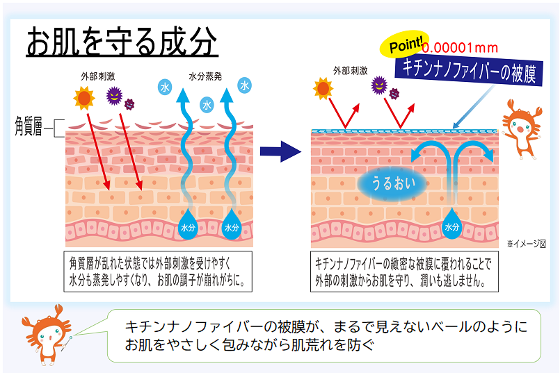 キチンナノファイバーを肌に塗ると、荒れた角質層の上に微細な被膜ができ、バリア機能を高めて肌を刺激から守ってくれます。まるで、カニの殻のように。