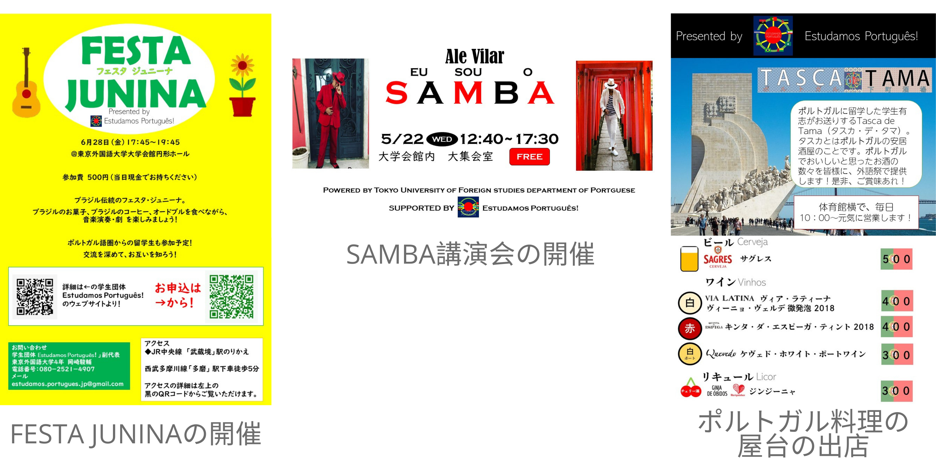 私たちはこれまで、ポルトガル語圏の文化を広めるための様々なイベントを企画してきました。一昨年の例で言うと、ブラジルのお祭り「FESTA JUNINA」やブラジルからプロダンサーをお呼びしたSAMBA講演会を開催したり、ポルトガル料理を提供する屋台を出店したりしました!