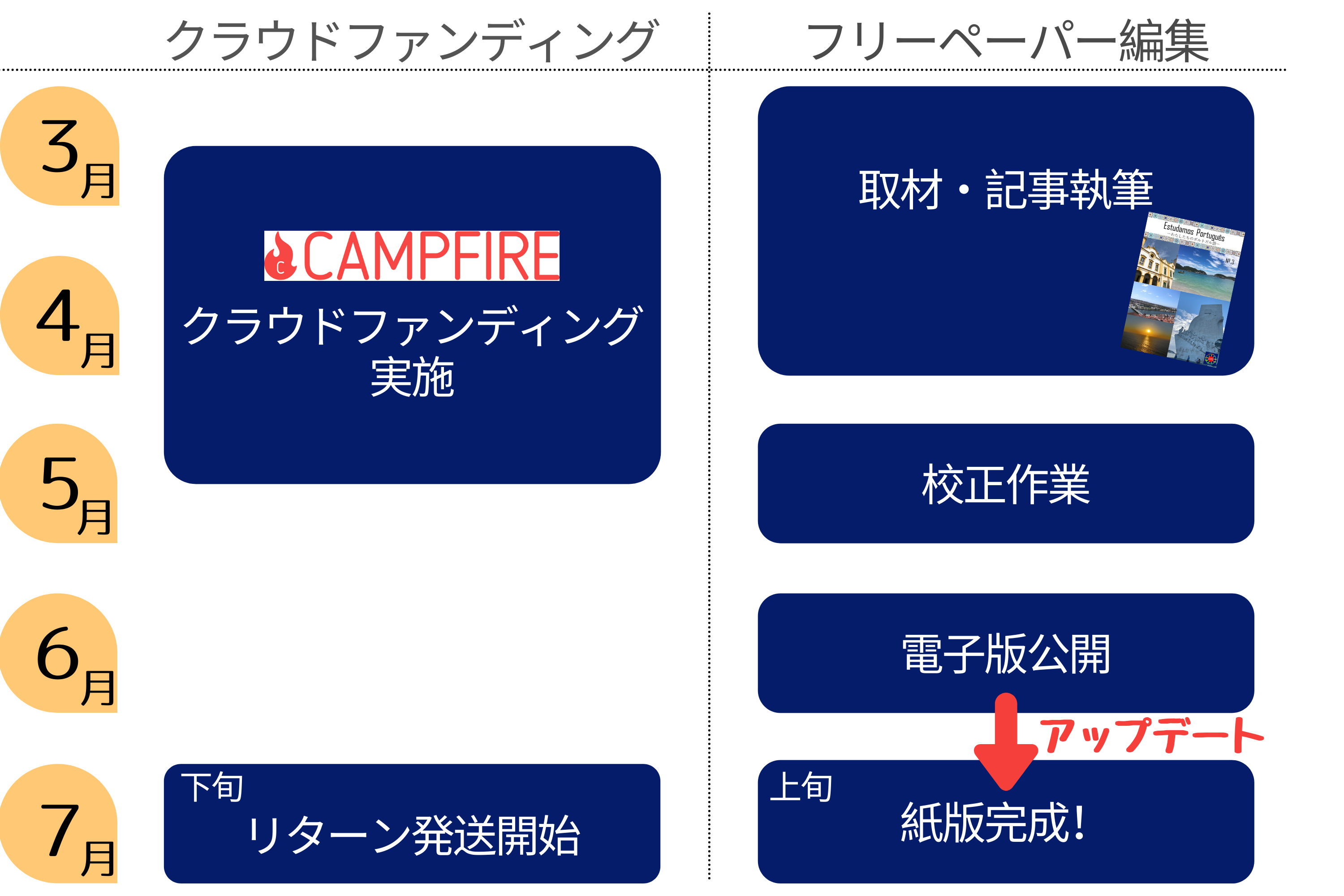 今回のプロジェクトのスケジュールは以下の通りです。第3号のテーマの国際的スポーツ大会に合わせて、開会式の開催予定日の7月23日に間に合うように紙版フリーペーパーの発行・発送すべく準備しています!
